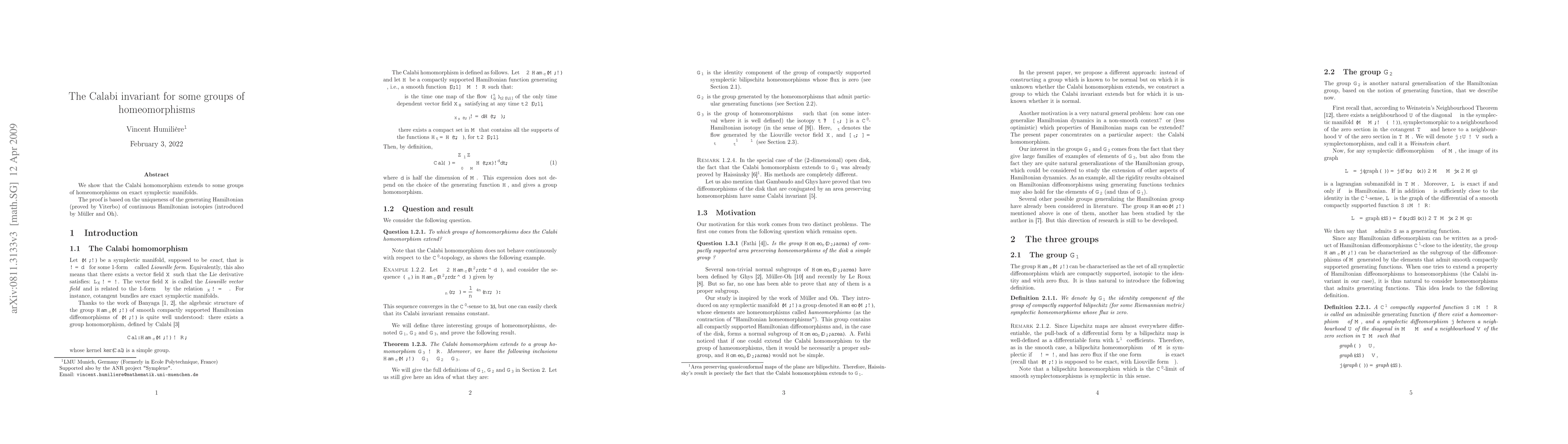 We show that the Calabi homomorphism extends to some groups of homeomorphisms on exact symplectic manifolds. The construction is based on the uniqueness of the generating Hamiltonian (proved by Viterbo) of continuous Hamiltonian isotopies (introduced by Mueller and Oh).