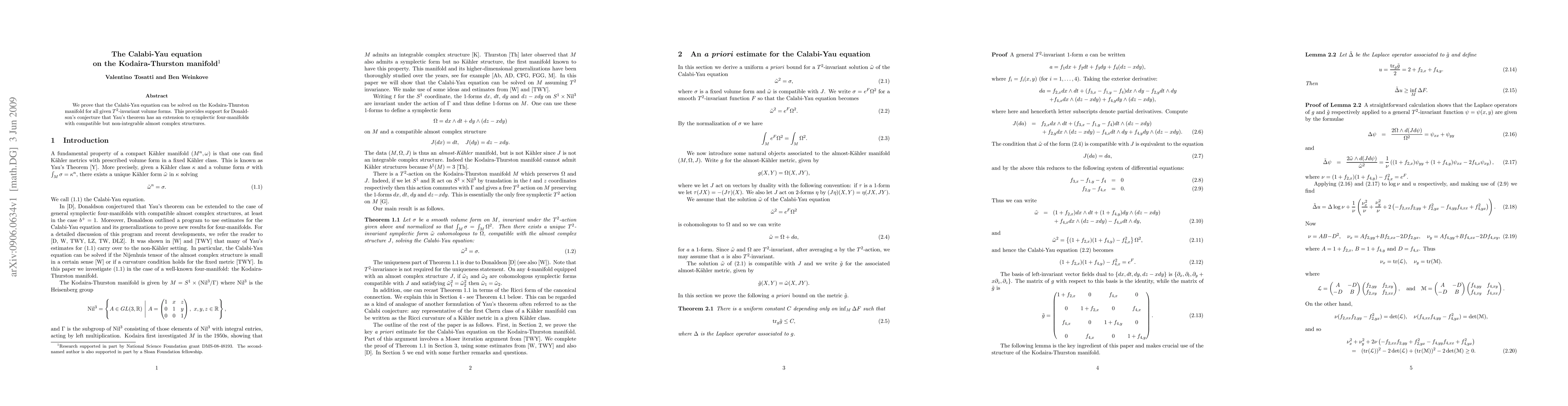 Summary: This paper proves the solvability of the Calabi-Yau equation on the Kodaira-Thurston manifold for all $T^2$-invariant volume forms, supporting Donaldson's conjecture on extending Yau's theorem to symplectic four-manifolds with non-integrable almost complex structures.