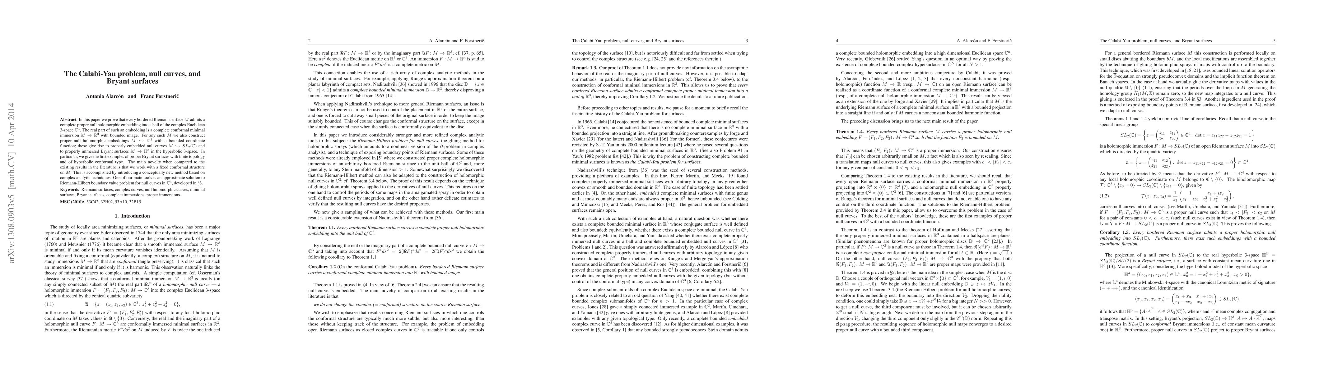 In this paper we prove that every bordered Riemann surface M admits a complete proper null holomorphic embedding into a ball of the complex Euclidean $3$-space $\mathbb{C}^3$. The real part of such an embedding is a complete conformal minimal immersion $M\to \mathbb{R}^3$ with bounded image. For any such $M$ we also construct proper null holomorphic embeddings $M\to \mathbb{C}^3$ with a bounded coordinate function; these give rise to properly embedded null curves $M\to SL_2(\mathbb{C})$ and to properly immersed Bryant surfaces $M\to \mathbb{H}^3$ in the hyperbolic $3$-space. In particular, we give the first examples of proper Bryant surfaces with finite topology and of hyperbolic conformal type. The main novelty when compared to the existing results in the literature is that we work with a fixed conformal structure on $M$. This is accomplished by introducing a conceptually new method based on complex analytic techniques. One of our main tools is an approximate solution to the Riemann-Hilbert boundary value problem for null curves in $\mathbb{C}^3$.