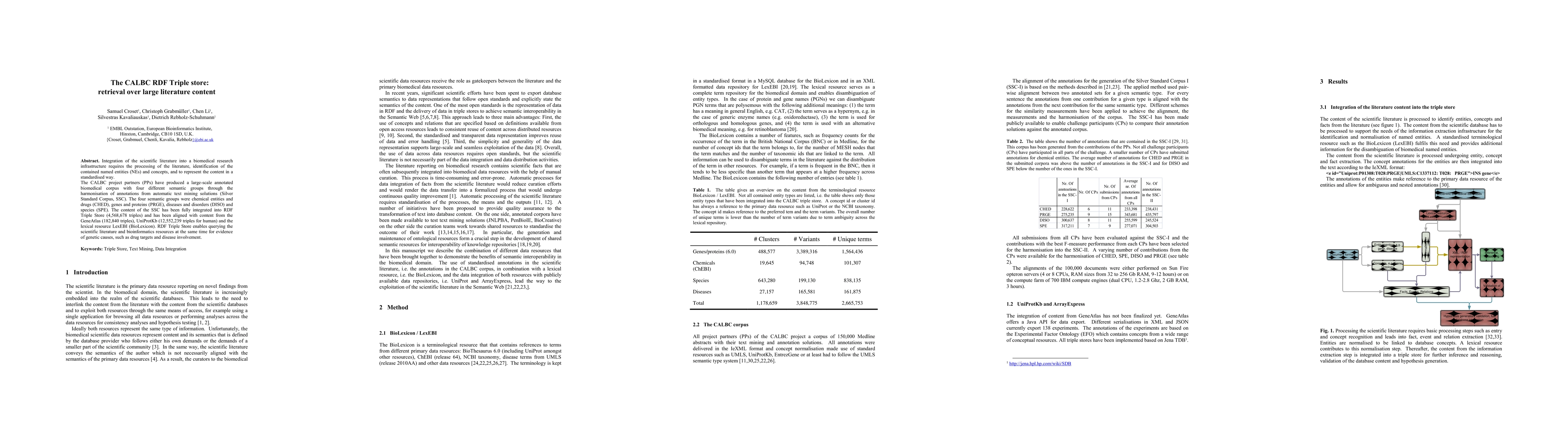 The CALBC project developed an RDF Triple Store integrating a large-scale annotated biomedical corpus, enabling simultaneous querying of scientific literature and bioinformatics resources for genetic evidence, such as drug targets and disease involvement. The corpus harmonizes annotations from text mining and aligns with GeneAtlas, UniProtKb, and LexEBI.