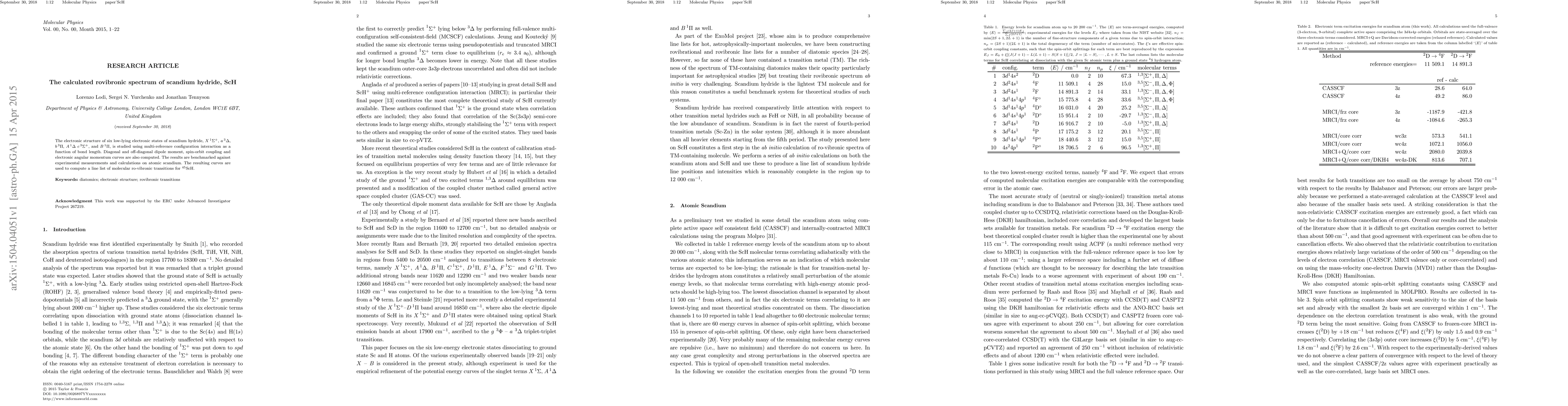 Researchers studied the electronic structure of scandium hydride using multi-reference configuration interaction to predict its rovibronic spectrum, which is benchmarked against experimental measurements and atomic calculations.