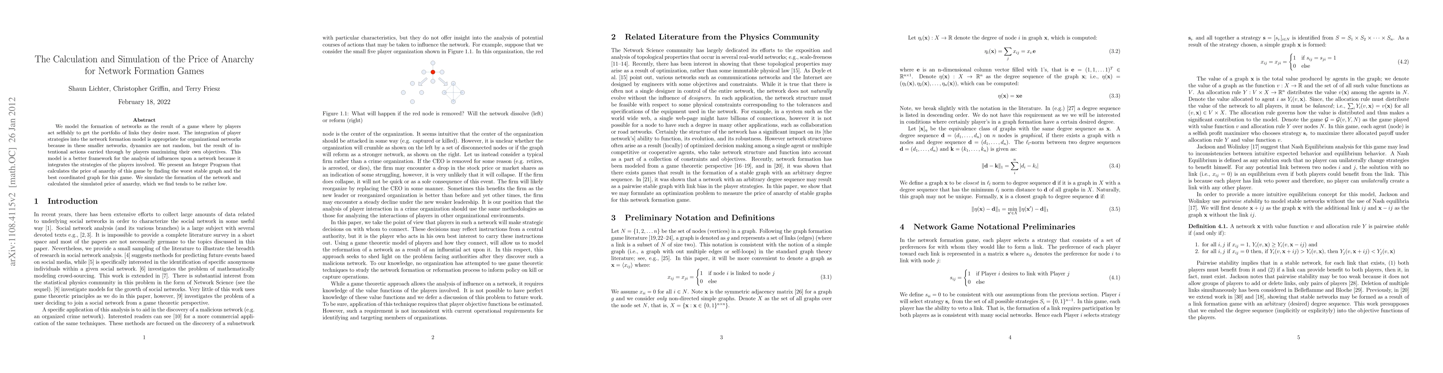 We model the formation of networks as the result of a game where by players act selfishly to get the portfolio of links they desire most. The integration of player strategies into the network formation model is appropriate for organizational networks because in these smaller networks, dynamics are not random, but the result of intentional actions carried through by players maximizing their own objectives. This model is a better framework for the analysis of influences upon a network because it integrates the strategies of the players involved. We present an Integer Program that calculates the price of anarchy of this game by finding the worst stable graph and the best coordinated graph for this game. We simulate the formation of the network and calculated the simulated price of anarchy, which we find tends to be rather low.