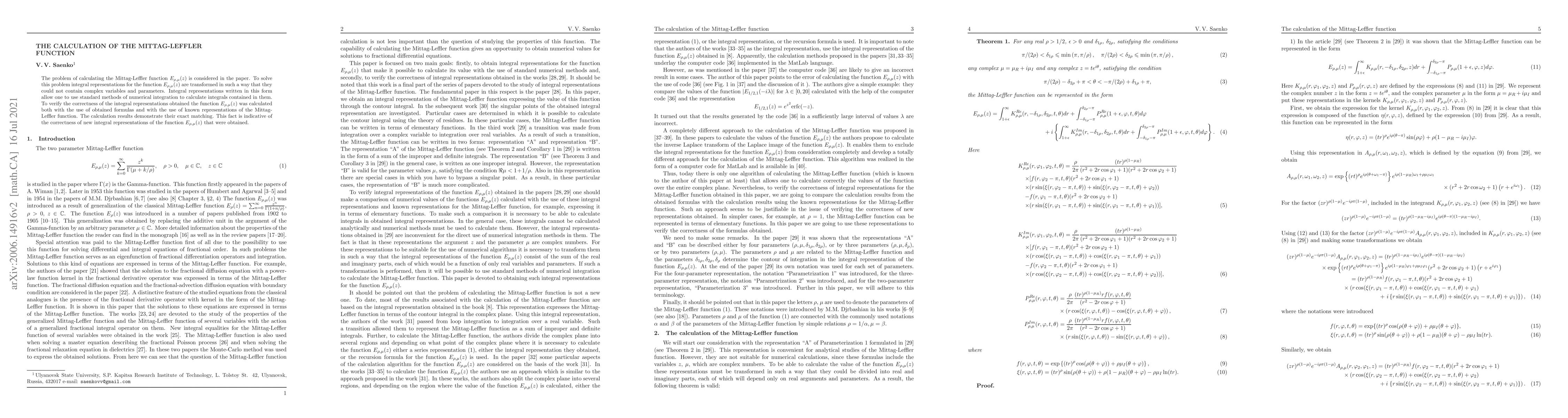The problem of calculating the Mittag-Leffler function $E_{\rho,\mu} (z)$ is considered in the paper. To solve this problem integral representations for the function $E_{\rho,\mu}(z)$ are transformed in such a way that they could not contain complex variables and parameters. Integral representations written in this form allow one to use standard methods of numerical integration to calculate integrals contained in them. To verify the correctness of the integral representations obtained the function $E_{\rho,\mu}(z)$ was calculated both with the use of obtained formulas and with the use of known representations of the Mittag-Leffler function. The calculation results demonstrate their exact matching. This fact is indicative of the correctness of new integral representations of the function $E_{\rho,\mu}(z)$ that were obtained.
