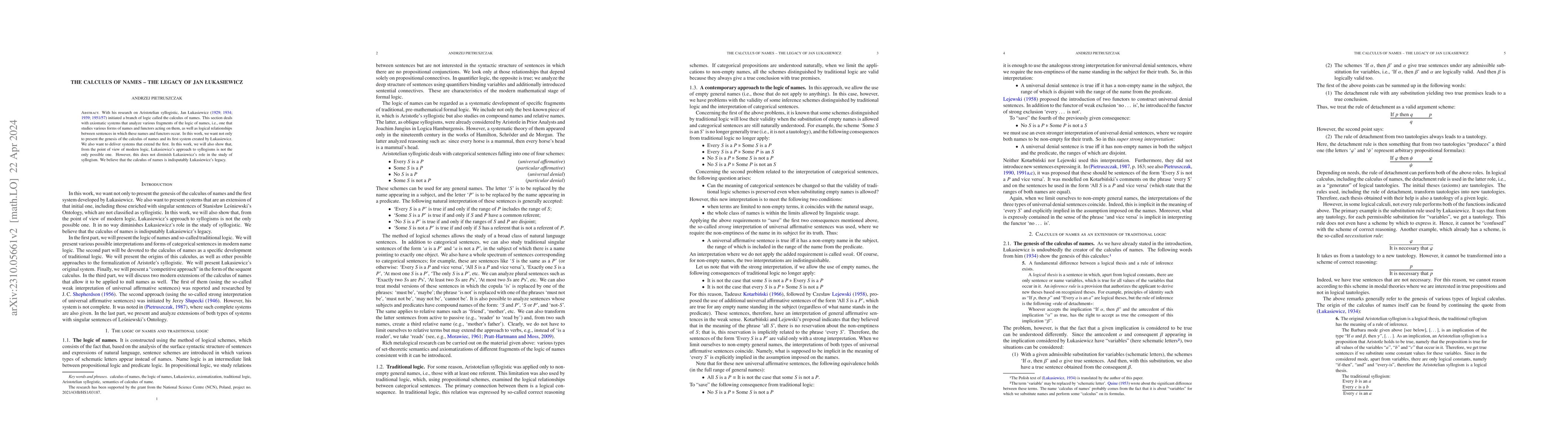 This study preserves and expands upon Łukasiewicz's legacy in the calculus of names, providing a framework for understanding and extending his work, which is crucial for the historical and philosophical study of logic.