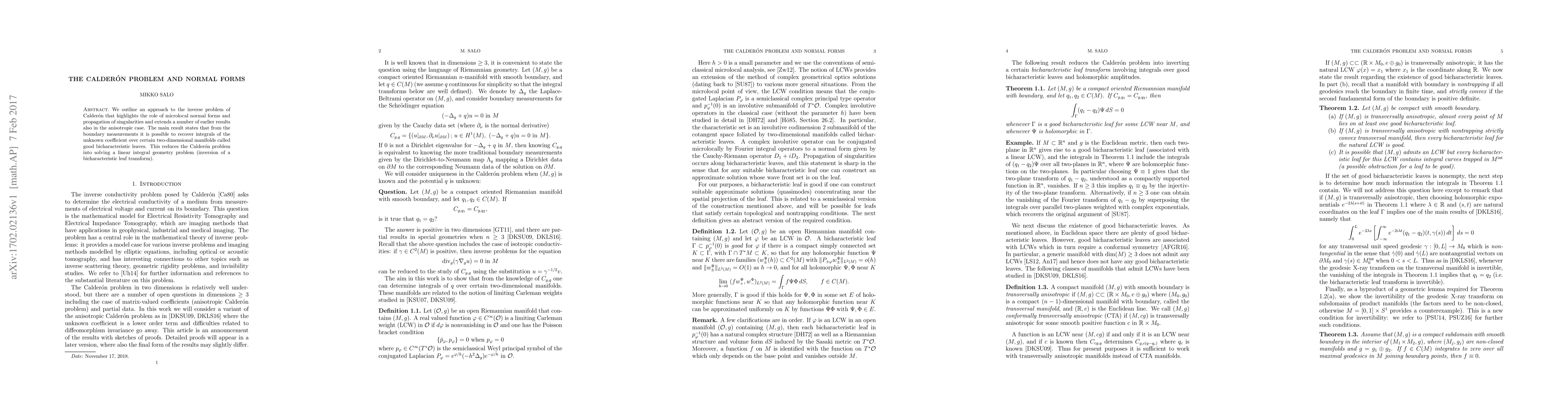 We outline an approach to the inverse problem of Calder\'on that highlights the role of microlocal normal forms and propagation of singularities and extends a number of earlier results also in the anisotropic case. The main result states that from the boundary measurements it is possible to recover integrals of the unknown coefficient over certain two-dimensional manifolds called good bicharacteristic leaves. This reduces the Calder\'on problem into solving a linear integral geometry problem (inversion of a bicharacteristic leaf transform).