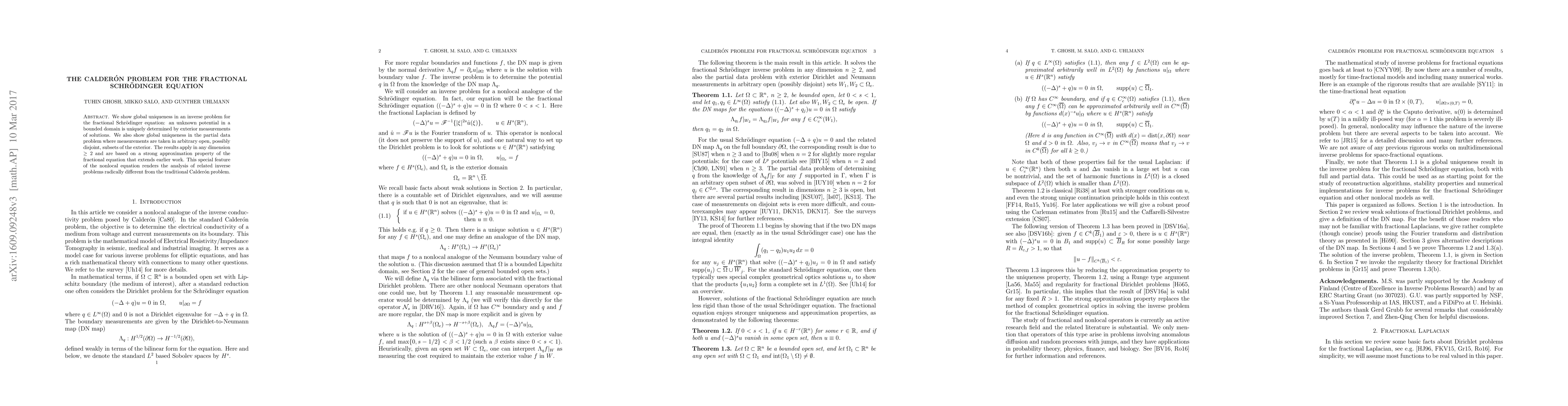 The novelty lies in demonstrating global uniqueness for the fractional Schrödinger equation in any dimension \(\geq 2\) using a strong approximation property, contrasting with the traditional Calderón problem that typically deals with local equations.