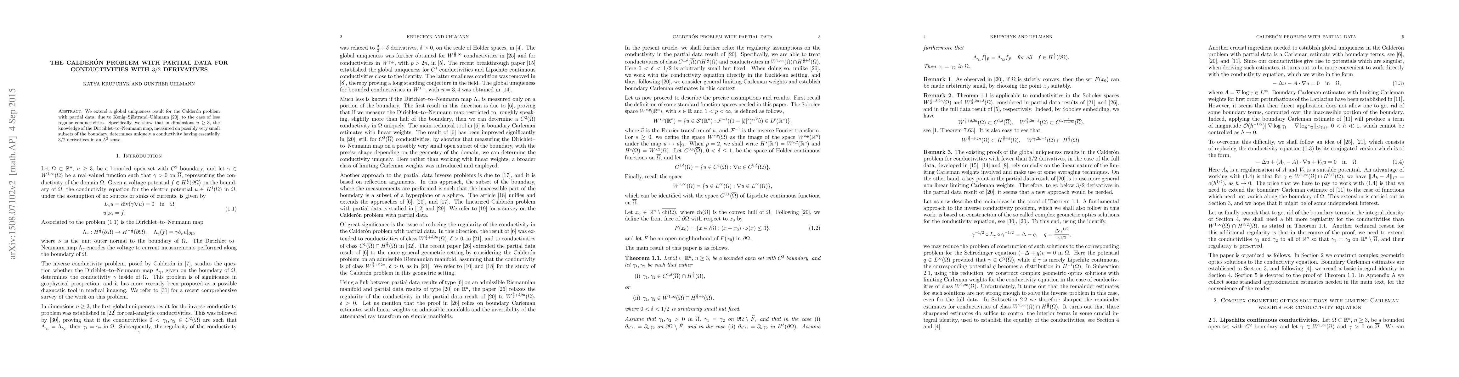 This paper extends the global uniqueness result for the Calderón problem with partial data to conductivities with $3/2$ derivatives. It demonstrates that partial Dirichlet-to-Neumann map measurements on small boundary subsets uniquely determine such conductivities in dimensions $n \ge 3$.