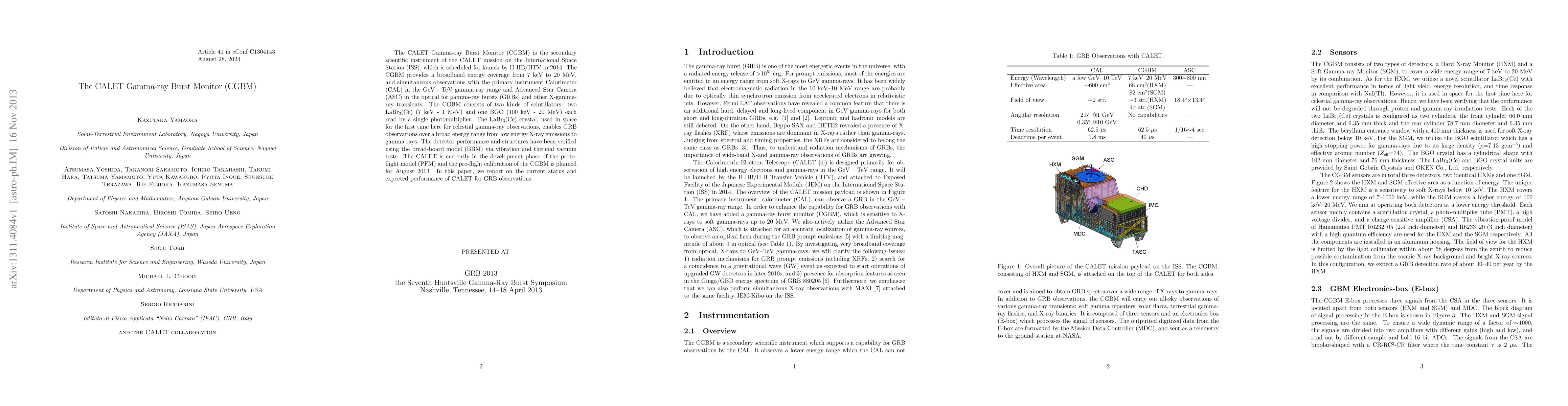 The CALET Gamma-ray Burst Monitor (CGBM) is a secondary instrument on the CALET mission set to launch in 2014, designed to observe gamma-ray bursts and transients across a broad energy spectrum from 7 keV to 20 MeV using scintillator detectors, including the first space-based use of LaBr$_3$(Ce) crystals. The CGBM has undergone verification tests and is currently in the development phase with pre-flight calibration planned for August 2013.