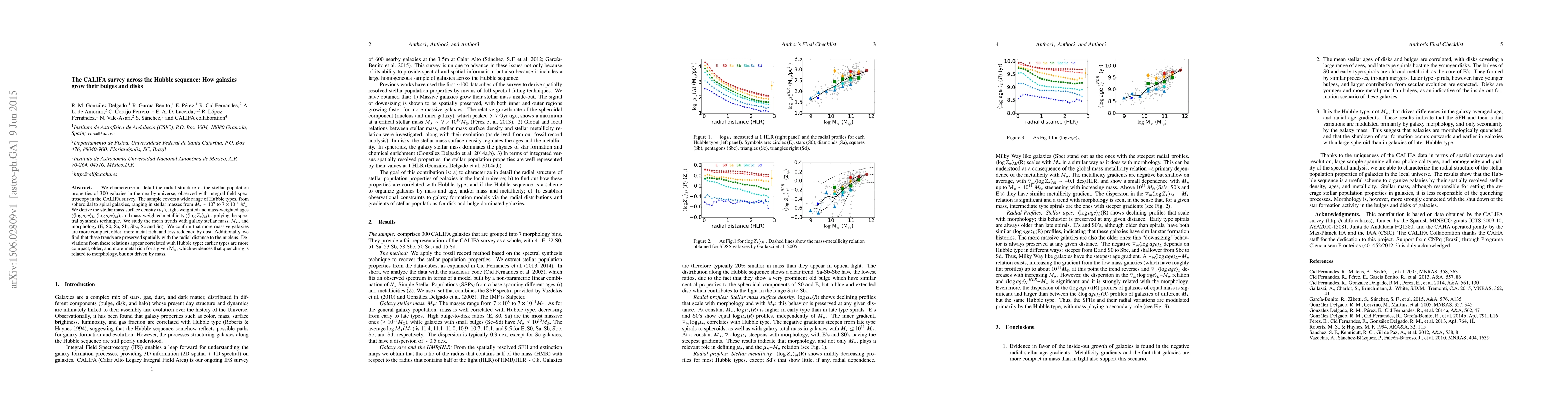 The CALIFA survey investigates the radial structure of 300 nearby galaxies, revealing that more massive galaxies are more compact, older, and metal-rich, with these trends preserved spatially. Earlier Hubble types show more pronounced characteristics for a given stellar mass, indicating that quenching is morphology-dependent rather than mass-driven.
