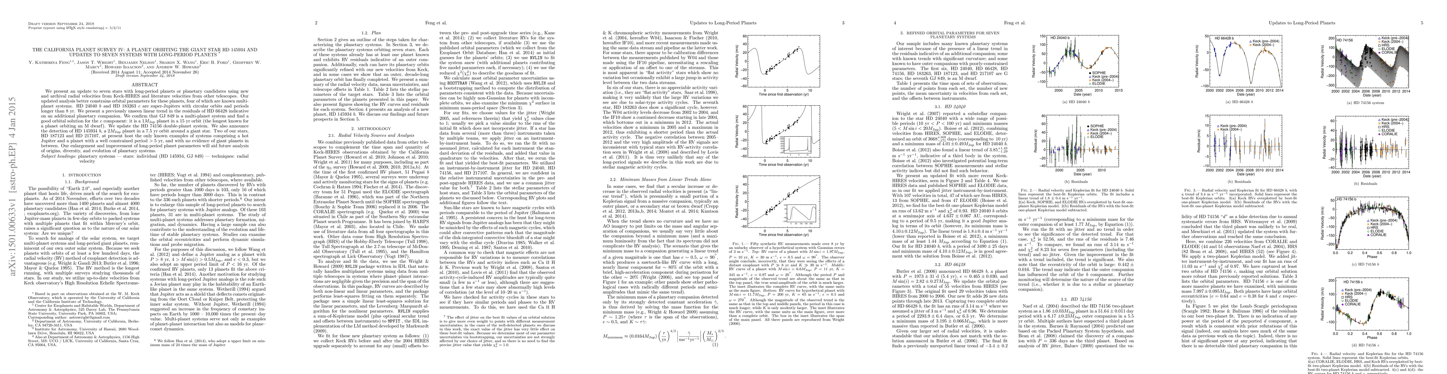 The California Planet Survey IV updates the orbital parameters of seven long-period planetary systems, confirming multi-planet systems and revealing new planetary companions. Notably, HD 145934 b, a 2 Jupiter mass planet orbiting a giant star, is detected, and GJ 849 is confirmed as a multi-planet system with a 15-year orbit planet.