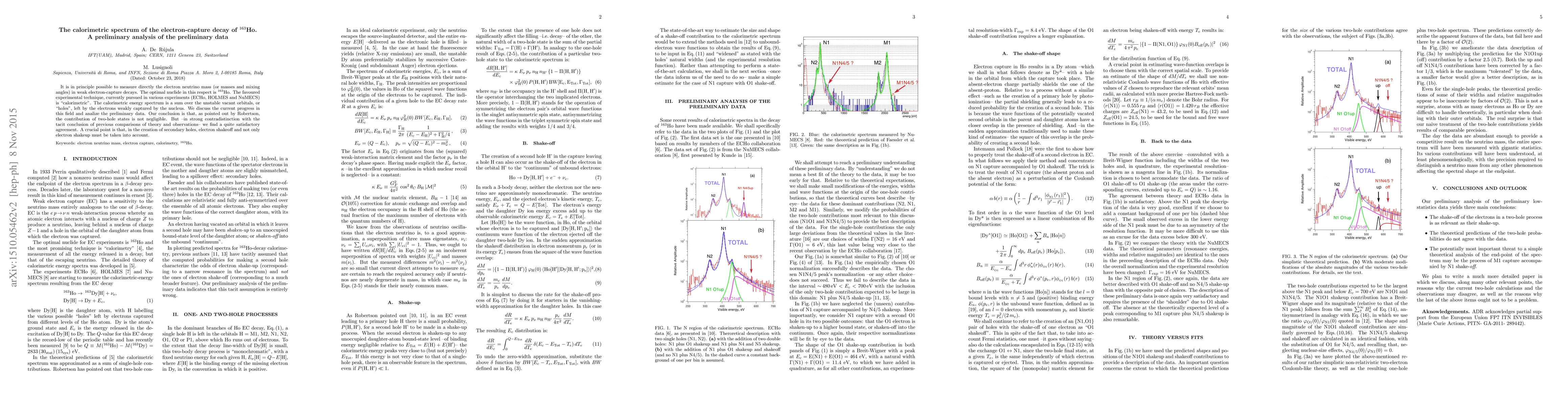 It is in principle possible to measure directly the electron neutrino mass (or masses and mixing angles) in weak electron-capture decays. The optimal nuclide in this respect is $^{163}$Ho. The favoured experimental technique, currently pursued in various experiments (ECHo, HOLMES and NuMECS) is "calorimetric". The calorimetric energy spectrum is a sum over the unstable vacant orbitals, or "holes", left by the electrons weakly captured by the nucleus. We discuss the current progress in this field and analize the preliminary data. Our conclusion is that, as pointed out by Robertson, the contribution of two-hole states is not negligible. But --in strong contradistinction with the tacit conclusion of previous comparisons of theory and observations-- we find a quite satisfactory agreement. A crucial point is that, in the creation of secondary holes, electron shakeoff and not only electron shakeup must be taken into account.