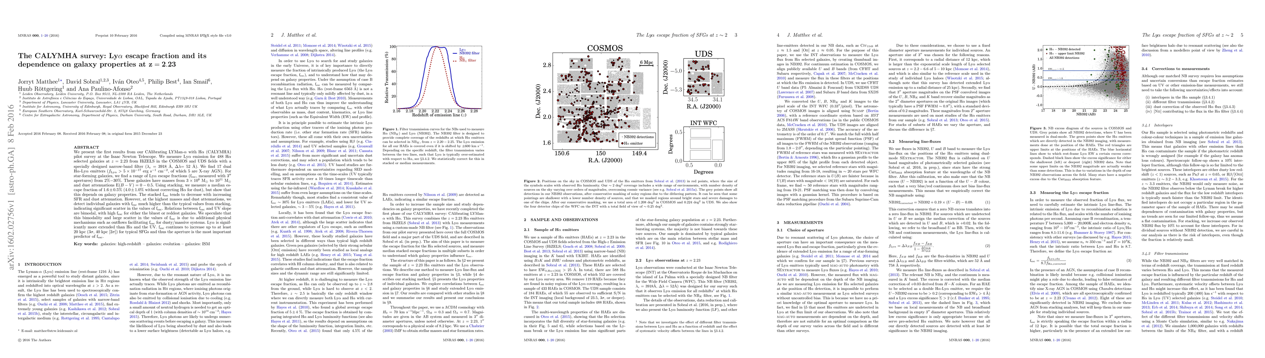 We present the first results from our CAlibrating LYMan-$\alpha$ with H$\alpha$ (CALYMHA) pilot survey at the Isaac Newton Telescope. We measure Ly$\alpha$ emission for 488 H$\alpha$ selected galaxies at $z=2.23$ from HiZELS in the COSMOS and UDS fields with a specially designed narrow-band filter ($\lambda_c$ = 3918 {\AA}, $\Delta\lambda$= 52 {\AA}). We find 17 dual H$\alpha$-Ly$\alpha$ emitters ($f_{\rm Ly\alpha} >5\times10^{-17}$ erg s$^{-1}$ cm$^{-2}$, of which 5 are X-ray AGN). For star-forming galaxies, we find a range of Ly$\alpha$ escape fractions (f$_{\rm esc}$, measured with 3$"$ apertures) from $2$\%$-30$\%. These galaxies have masses from $3\times10^8$ M$_{\odot}$ to 10$^{11}$ M$_{\odot}$ and dust attenuations E$(B-V)=0-0.5$. Using stacking, we measure a median escape fraction of $1.6\pm0.5$\% ($4.0\pm1.0$\% without correcting H$\alpha$ for dust), but show that this depends on galaxy properties. The stacked f$_{\rm esc}$ tends to decrease with increasing SFR and dust attenuation. However, at the highest masses and dust attenuations, we detect individual galaxies with f$_{\rm esc}$ much higher than the typical values from stacking, indicating significant scatter in the values of f$_{\rm esc}$. Relations between f$_{\rm esc}$ and UV slope are bimodal, with high f$_{\rm esc}$ for either the bluest or reddest galaxies. We speculate that this bimodality and large scatter in the values of f$_{\rm esc}$ is due to additional physical mechanisms such as outflows facilitating f$_{\rm esc}$ for dusty/massive systems. Ly$\alpha$ is significantly more extended than H$\alpha$ and the UV. f$_{\rm esc}$ continues to increase up to at least 20 kpc (3$\sigma$, 40 kpc [2$\sigma$]) for typical SFGs and thus the aperture is the most important predictor of f$_{\rm esc}$.