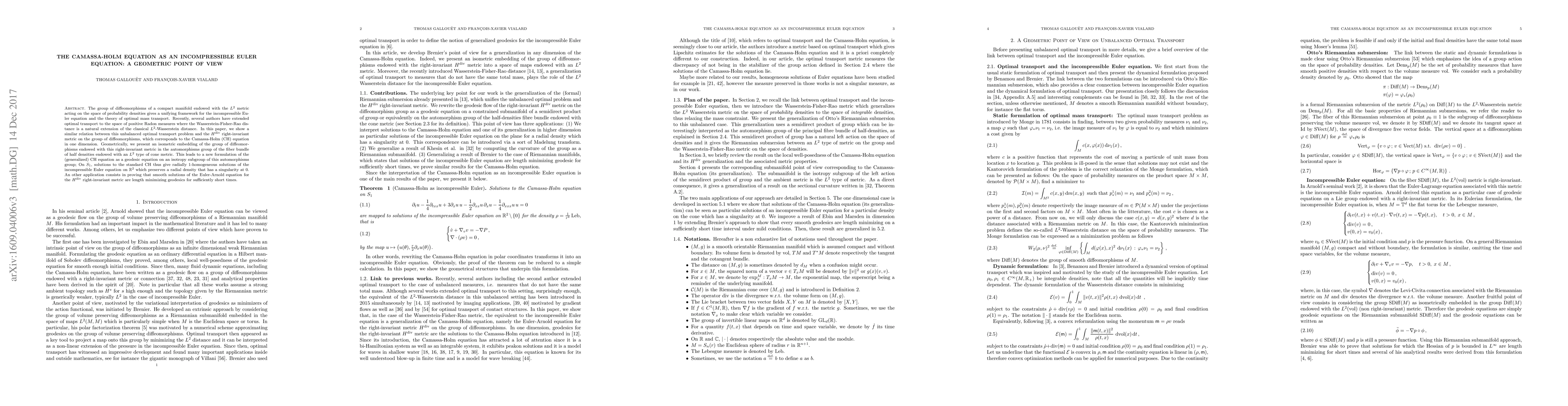 This paper explores the geometric relationship between the Camassa-Holm equation and the incompressible Euler equation through the lens of optimal mass transport and diffeomorphism groups. It establishes a new formulation of the Camassa-Holm equation as a geodesic equation, linking it to the Euler-Arnold equation and proving that its solutions are length minimizing geodesics.