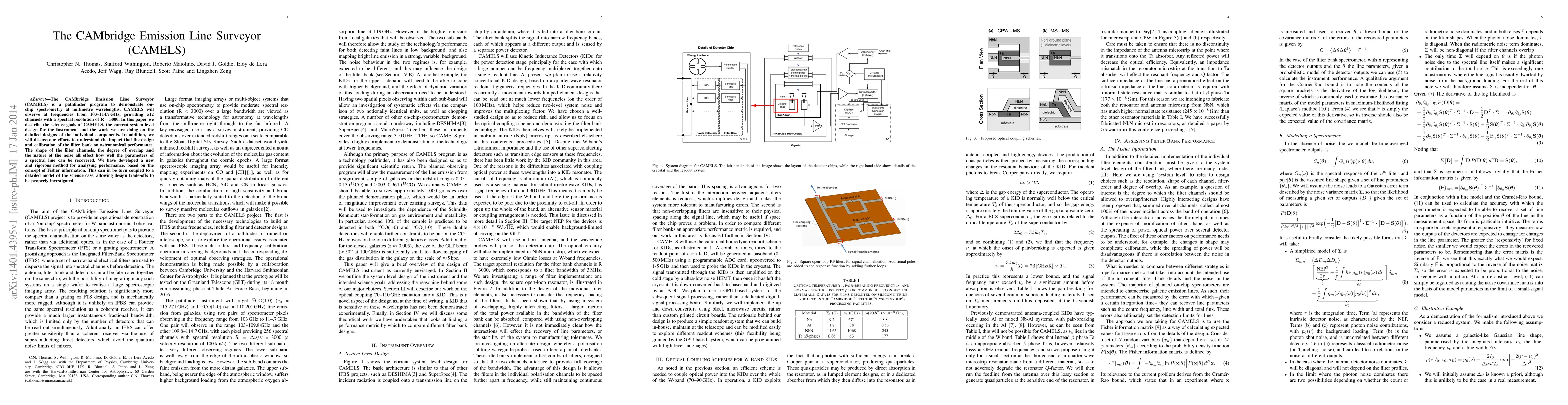 The CAMbridge Emission Line Surveyor (CAMELS) is a pathfinder program to demonstrate on-chip spectrometry at millimetre wavelengths. CAMELS will observe at frequencies from 103-114.7 GHz, providing 512 channels with a spectral resolution of R = 3000. In this paper we describe the science goals of CAMELS, the current system level design for the instrument and the work we are doing on the detailed designs of the individual components. In addition, we will discuss our efforts to understand the impact that the design and calibration of the filter bank on astronomical performance. The shape of the filter channels, the degree of overlap and the nature of the noise all effect how well the parameters of a spectral line can be recovered. We have developed a new and rigorous method for analysing performance, based on the concept of Fisher information. This can in be turn coupled to a detailed model of the science case, allowing design trade-offs to be properly investigated.