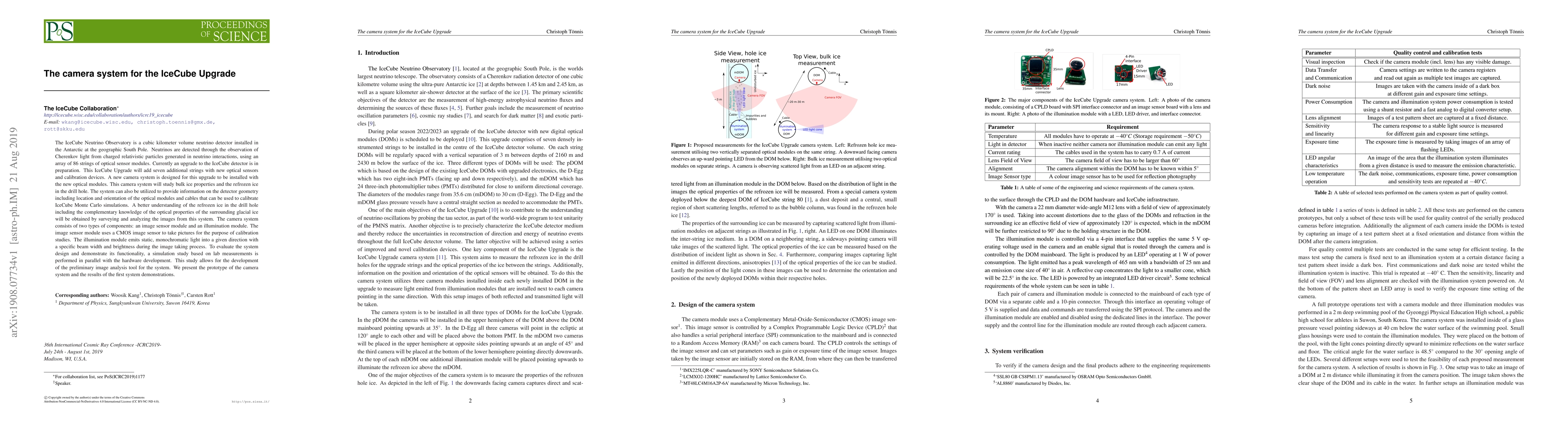 The IceCube Upgrade introduces a new camera system to add seven additional strings with optical sensors, enhancing the detector's geometry and calibration. The system comprises an image sensor module and an illumination module for studying ice properties and aiding in calibration studies.