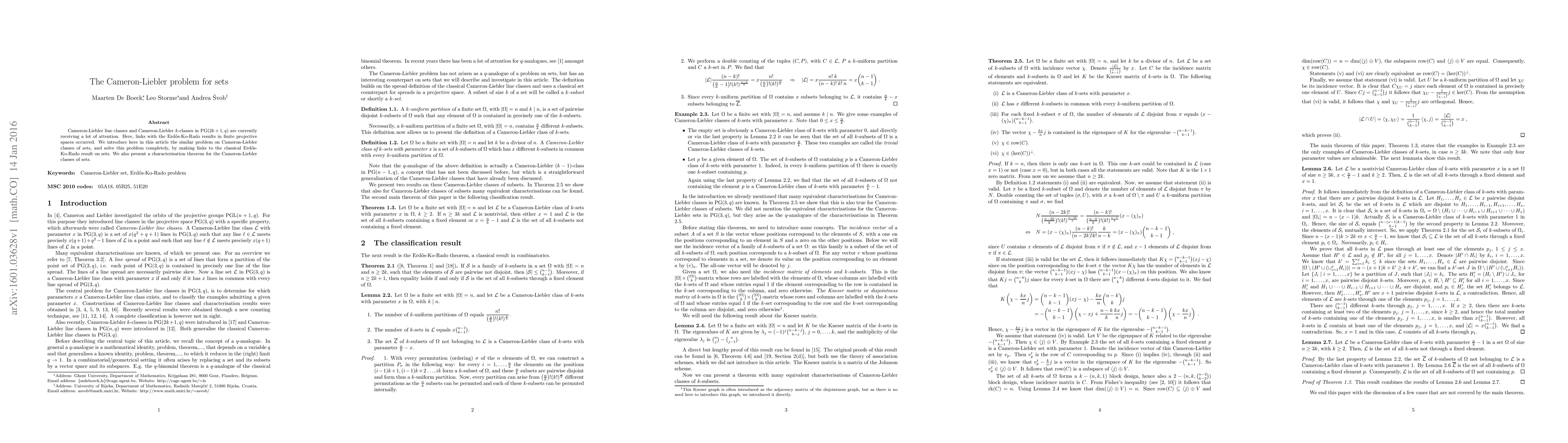 The paper investigates Cameron-Liebler classes of sets, introducing a set counterpart to the Cameron-Liebler line classes in projective spaces, and linking it to the classical Erdős-Ko-Rado theorem.