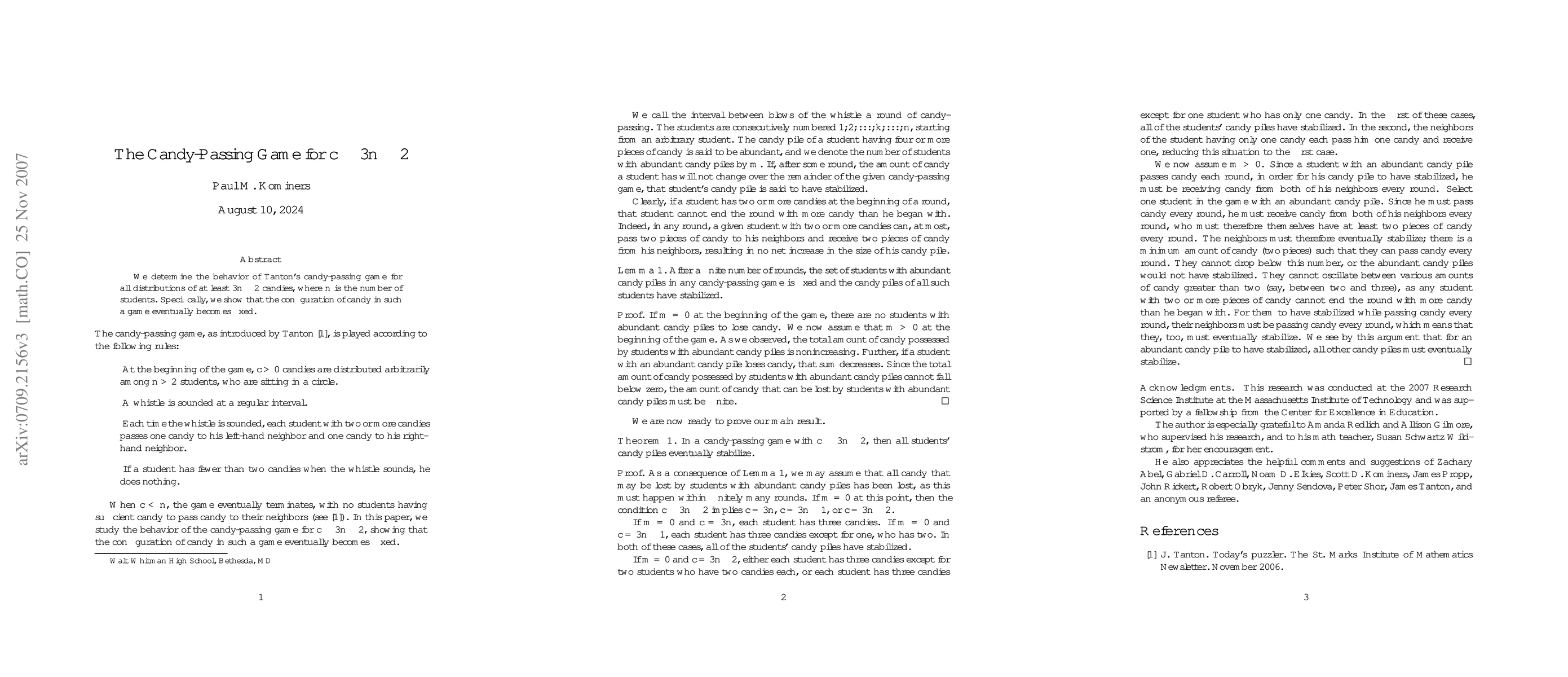Summary: This paper investigates Tanton's candy-passing game with at least 3n-2 candies among n students, demonstrating that the candy distribution eventually stabilizes regardless of initial configuration.