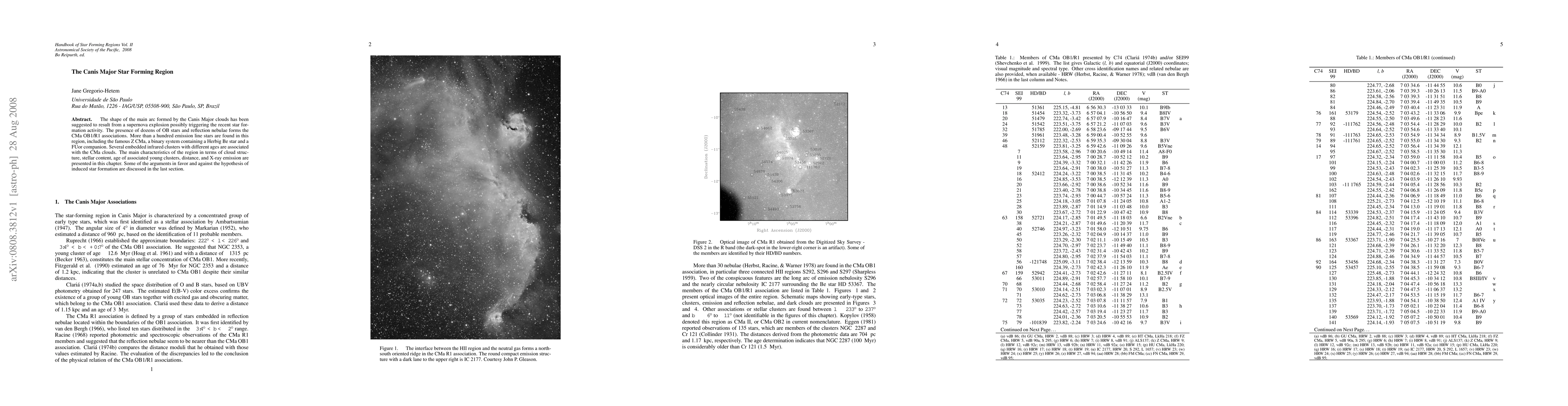 The shape of the main arc formed by the Canis Major clouds has been suggested to result from a supernova explosion possibly triggering the recent star formation activity. The presence of dozens of OB stars and reflection nebulae forms the CMa OB1/R1 associations. More than a hundred emission line stars are found in this region, including the famous Z CMa, a binary system containing a Herbig Be star and a FUor companion. Several embedded infrared clusters with different ages are associated with the CMa clouds. The main characteristics of the region in terms of cloud structure, stellar content, age of associated young clusters, distance, and X-ray emission are presented in this chapter. Some of the arguments in favor and against the hypothesis of induced star formation are discussed in the last section.