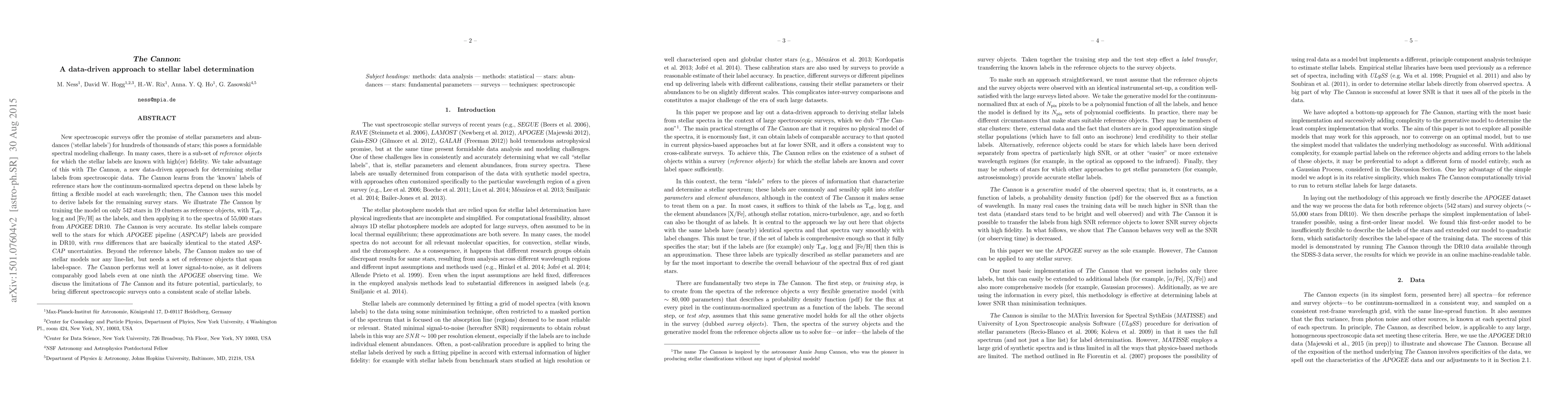 The Cannon is a data-driven method for determining stellar labels from spectroscopic data by learning from a subset of reference stars with known labels. It accurately derives stellar parameters for a large number of survey stars, matching the precision of existing pipelines and performing well even at lower signal-to-noise ratios.
