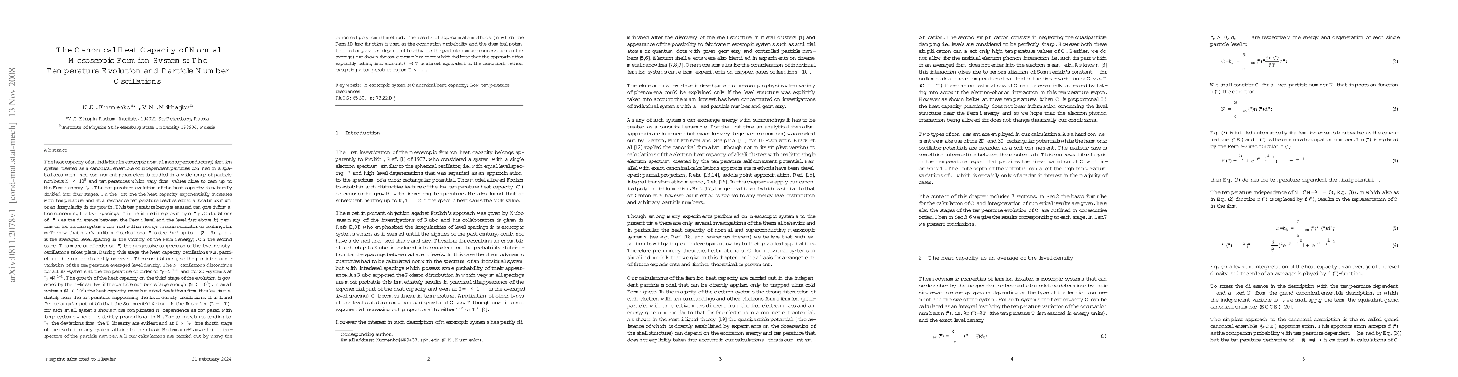 The heat capacity (C) of a mesoscopic nonsuperconducting fermion system treated as a canonical ensemble of independent particles is studied in a wide range of particle numbers and temperatures which vary from values close to zero up to the Fermi energy. The temperature evolution of C is naturally divided into four stages. On the first one the heat capacity exponentially increases with temperature and at a resonance temperature reaches either a local maximum or an irregularity in its growth. This resonance temperature being measured can give information concerning the level spacings in the immediate proximity of the Fermi energy. On the second stage the progressive suppression of the level density oscillations takes place. During this stage oscillations of C v.s. particle number N can be distinctly observed. These oscillations give the N-variations of the temperature averaged level density. The growth of C on the third stage of the evolution is governed by the T-linear law if the particle number is large enough (N>1000). It is found that the Sommerfeld factor in the linear law for such small systems shows more complicated N-dependence as compared with large systems where C is strictly proportional to N. For temperatures tending to the Fermi energy the deviations from the T-linearity are evident and at T larger than the Fermi energy (the fourth stage of the evolution) any system attains to the classic Boltzmann-Maxwell limit irrespective of the particle