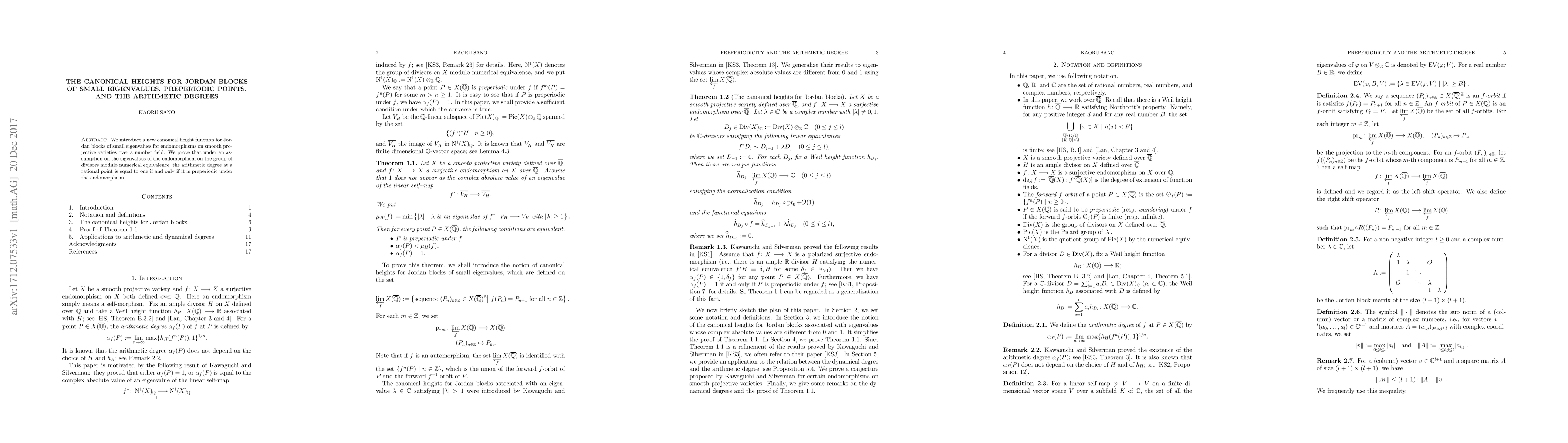 Summary: This paper introduces a new canonical height function for Jordan blocks of small eigenvalues in endomorphisms on smooth projective varieties over a number field. It establishes that the arithmetic degree at a rational point equals one if and only if the point is preperiodic under the endomorphism, given a specific eigenvalue assumption.