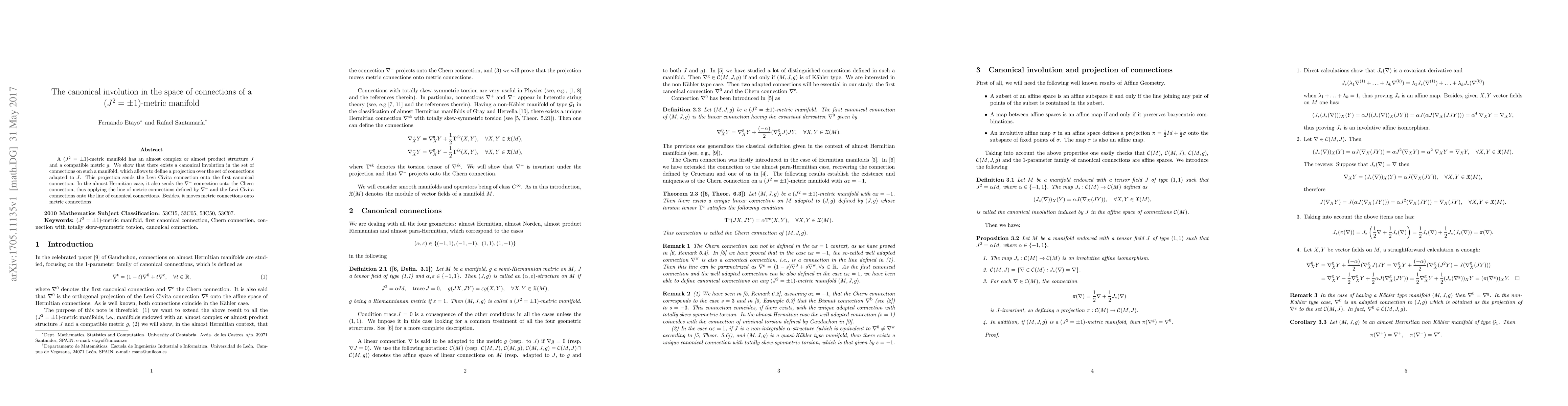 A $(J^{2}=\pm 1)$-metric manifold has an almost complex or almost product structure $J$ and a compatible metric $g$. We show that there exists a canonical involution in the set of connections on such a manifold, which allows to define a projection over the set of connections adapted to $J$. This projection sends the Levi Civita connection onto the first canonical connection. In the almost Hermitian case, it also sends the $\nabla^{-}$ connection onto the Chern connection, thus applying the line of metric connections defined by $\nabla ^{-}$ and the Levi Civita connections onto the line of canonical connections. Besides, it moves metric connections onto metric connections.