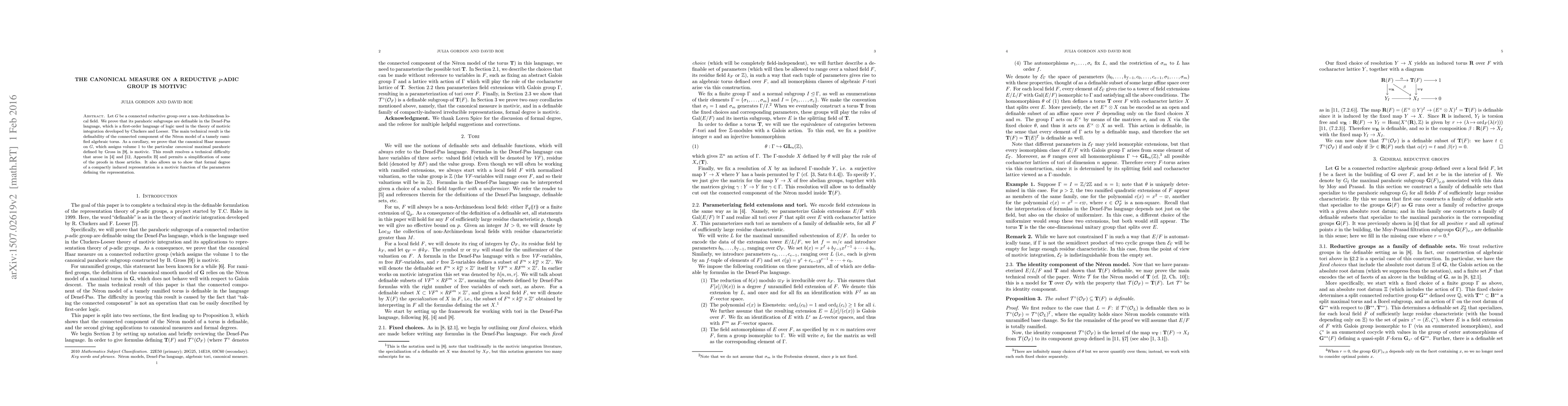 Let $G$ be a connected reductive group over a non-Archimedean local field. We prove that its parahoric subgroups are definable in the Denef-Pas language, which is a first-order language of logic used in the theory of motivic integration developed by Cluckers and Loeser. The main technical result is the definability of the connected component of the N\'eron model of a tamely ramified algebraic torus. As a corollary, we prove that the canonical Haar measure on $G$, which assigns volume $1$ to the particular \emph{canonical} maximal parahoric defined by Gross, is motivic. This result resolves a technical difficulty that arose in Cluckers-Gordon-Halupczok and Shin-Templier and permits a simplification of some of the proofs in those articles. It also allows us to show that formal degree of a compactly induced representation is a motivic function of the parameters defining the representation.