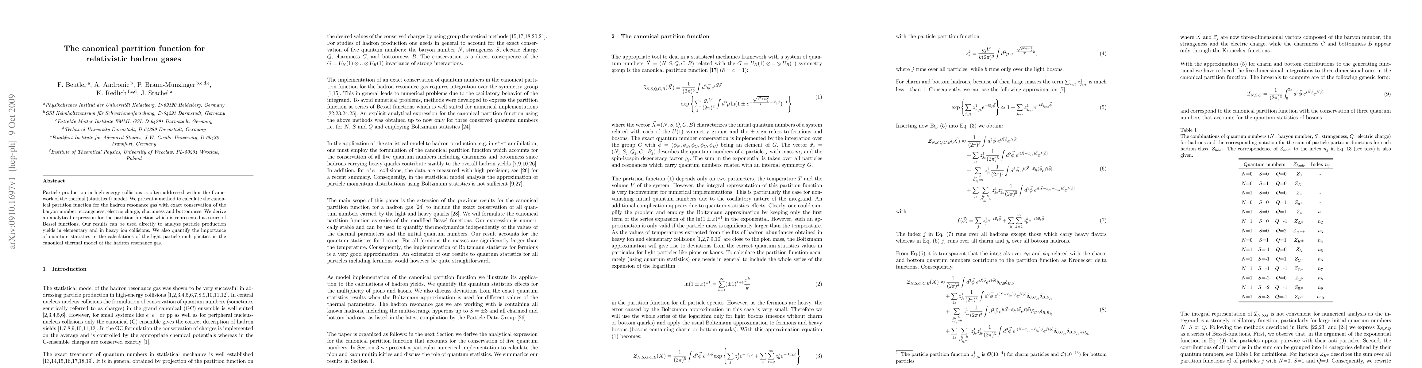 This paper presents a method for calculating the canonical partition function for relativistic hadron gases, ensuring exact conservation of baryon number, strangeness, charge, charmness, and bottomness. The derived analytical expression, represented as a series of Bessel functions, facilitates the analysis of particle production yields in high-energy collisions and highlights the significance of quantum statistics in light particle multiplicity calculations.