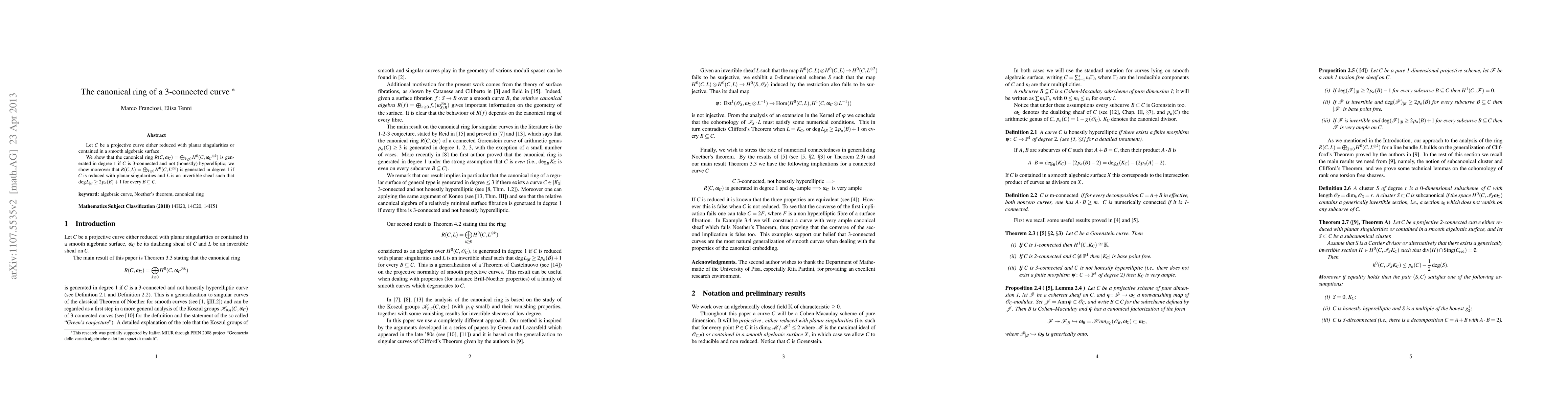 This paper demonstrates that the canonical ring of a 3-connected projective curve, either with planar singularities or embedded in a smooth surface, is generated in degree 1 under certain conditions. Specifically, it shows that R(C, ω_C) is generated in degree 1 if C is not hyperelliptic, and R(C, L) follows the same rule for suitable invertible sheaves L.