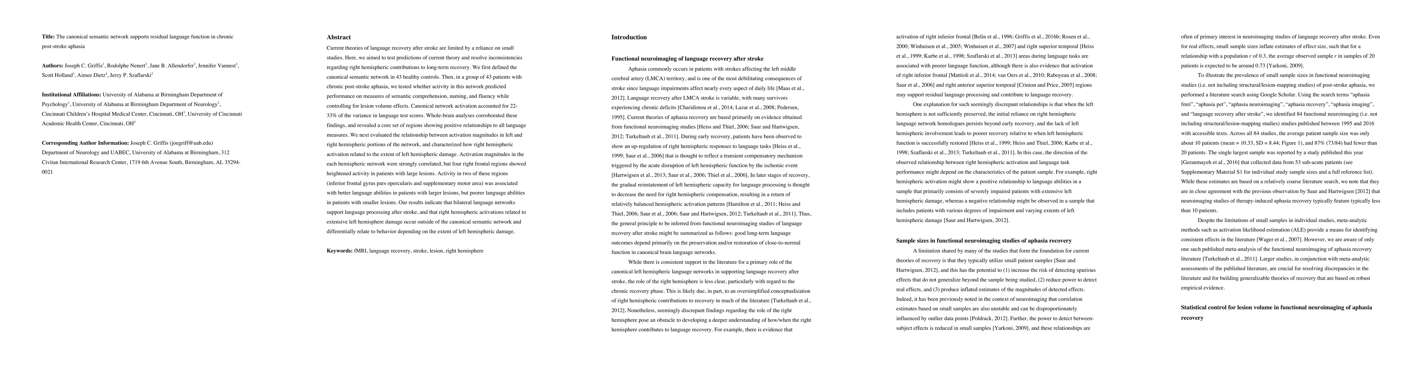 This study investigates the role of the canonical semantic network in chronic post-stroke aphasia, finding that its activation significantly predicts language performance. It reveals that right hemispheric regions, particularly in the frontal lobe, show heightened activity in patients with larger left hemisphere lesions, suggesting a differential contribution to language function based on the extent of left hemispheric damage.