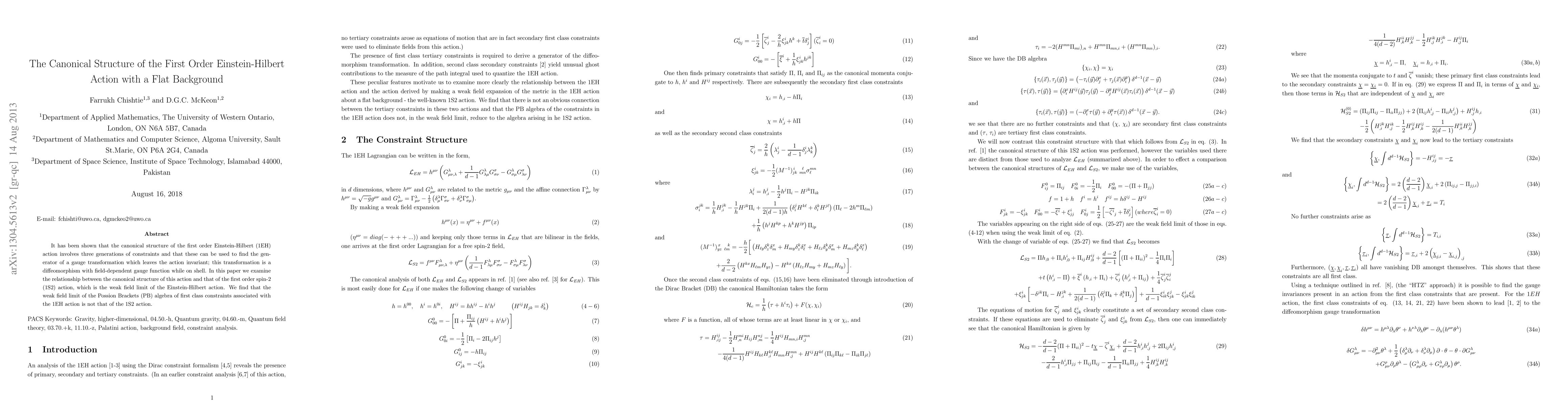 This paper investigates the canonical structure of the first order Einstein-Hilbert action and its constraints, revealing three generations of constraints. It finds that the weak field limit of the Poisson Brackets algebra for these constraints differs from that of the first order spin-2 action, indicating a nuanced relationship between the two.