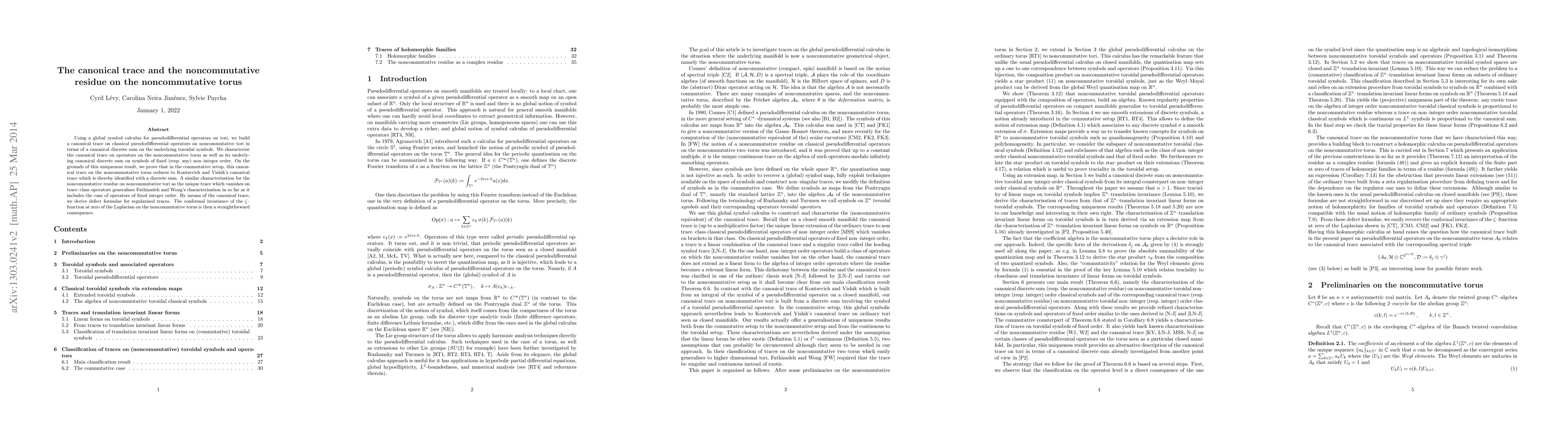 Using a global symbol calculus for pseudodifferential operators on tori, we build a canonical trace on classical pseudodifferential operators on noncommutative tori in terms of a canonical discrete sum on the underlying toroidal symbols. We characterise the canonical trace on operators on the noncommutative torus as well as its underlying canonical discrete sum on symbols of fixed (resp.\ any) non--integer order. On the grounds of this uniqueness result, we prove that in the commutative setup, this canonical trace on the noncommutative torus reduces to Kontsevich and Vishik's canonical trace which is thereby identified with a discrete sum. A similar characterisation for the noncommutative residue on noncommutative tori as the unique trace which vanishes on trace--class operators generalises Fathizadeh and Wong's characterisation in so far as it includes the case of operators of fixed integer order. By means of the canonical trace, we derive defect formulae for regularized traces. The conformal invariance of the $\zeta$--function at zero of the Laplacian on the noncommutative torus is then a straightforward consequence.