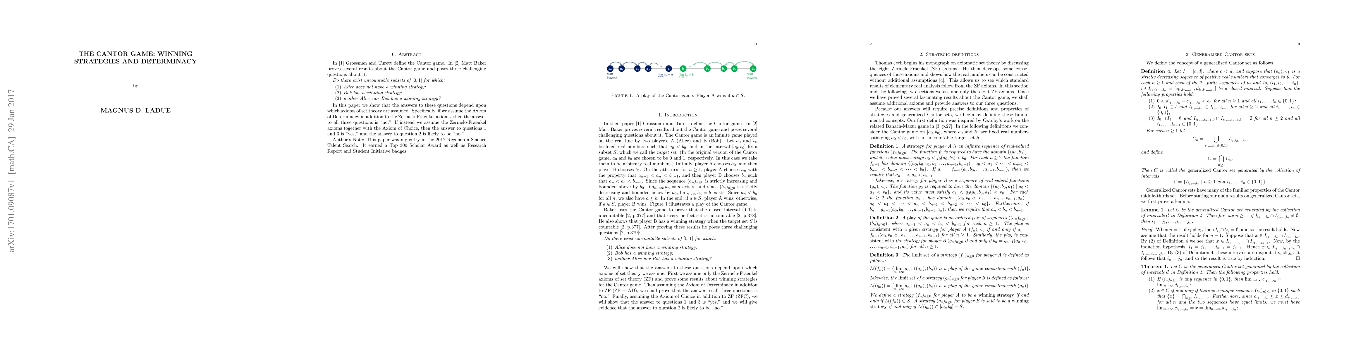 In Problem #1542 of Mathematics Magazine, Grossman and Turett define the Cantor game. In his 2007 Mathematics Magazine article about the Cantor game, Matt Baker proves several results and poses three challenging questions about it: Do there exist uncountable subsets of [0, 1] for which: Alice does not have a winning strategy; Bob has a winning strategy; neither Alice nor Bob has a winning strategy? In this paper we show that the answers to these questions depend upon which axioms of set theory are assumed. Specifically, if we assume the Axiom of Determinacy in addition to the Zermelo-Fraenkel axioms, then the answer to all three questions is "no." If instead we assume the Zermelo-Fraenkel axioms together with the Axiom of Choice, then the answer to questions 1 and 3 is "yes," and the answer to question 2 is likely to be "no." Author's Note: This paper was my entry in the 2017 Regeneron Science Talent Search. It earned a Top 300 Scholar Award as well as Research Report and Student Initiative badges.