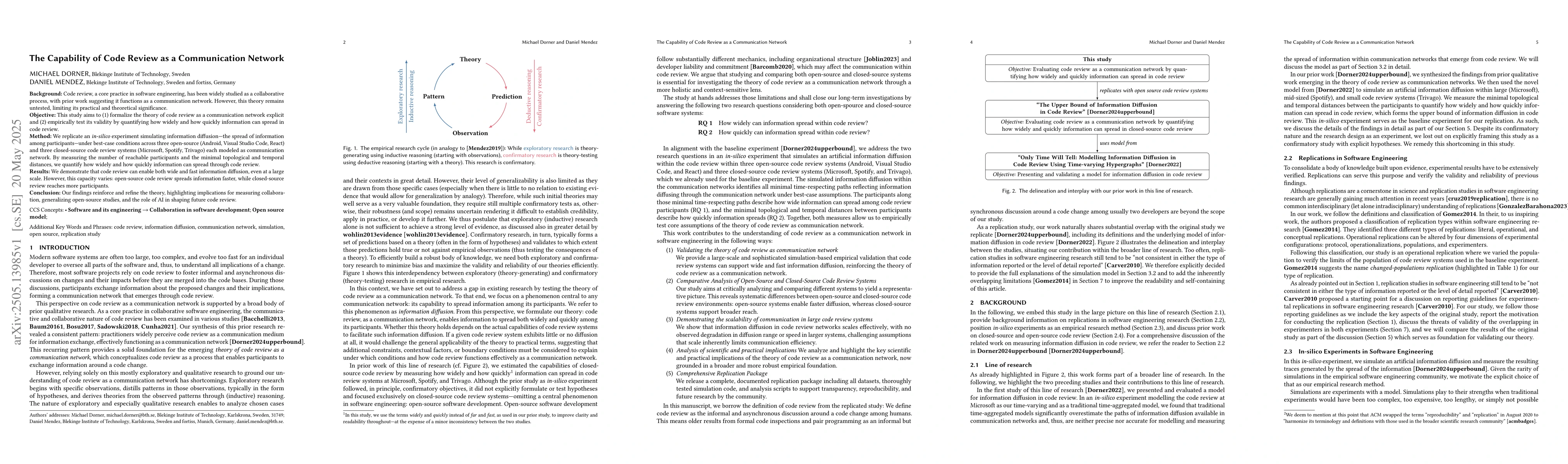 The study replicated an in-silico experiment simulating information diffusion across open-source (Android, VS Code, React) and closed-source (Microsoft, Spotify, Trivago) code review systems, modeling each as a communication network. It measured the number of reachable participants and minimal topological and temporal distances to quantify information spread.