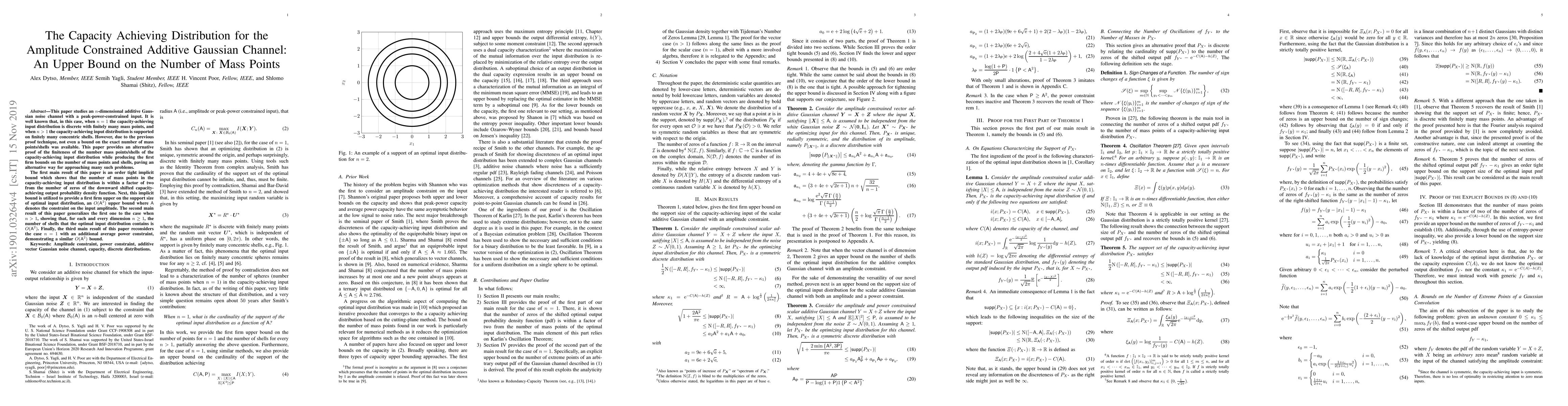 This paper studies an $n$-dimensional additive Gaussian noise channel with a peak-power-constrained input. It is well known that, in this case, when $n=1$ the capacity-achieving input distribution is discrete with finitely many mass points, and when $n>1$ the capacity-achieving input distribution is supported on finitely many concentric shells. However, due to the previous proof technique, neither the exact number of mass points/shells of the optimal input distribution nor a bound on it was available. This paper provides an alternative proof of the finiteness of the number mass points/shells of the capacity-achieving input distribution and produces the first firm bounds on the number of mass points and shells, paving an alternative way for approaching many such problems. Roughly, the paper consists of three parts. The first part considers the case of $n=1$. The first result, in this part, shows that the number of mass points in the capacity-achieving input distribution is within a factor of two from the downward shifted capacity-achieving output probability density function (pdf). The second result, by showing a bound on the number of zeros of the downward shifted capacity-achieving output pdf, provides a first firm upper on the number of mass points. Specifically, it is shown that the number of mass points is given by $O(\mathsf{A}^2)$ where $\mathsf{A}$ is the constraint on the input amplitude. The second part generalizes the results of the first part to the case of $n>1$. In particular, for every dimension $n>1$, it is shown that the number of shells is given by $O(\mathsf{A}^2)$ where $\mathsf{A}$ is the constraint on the input amplitude. Finally, the third part provides bounds on the number of points for the case of $n=1$ with an additional power constraint.