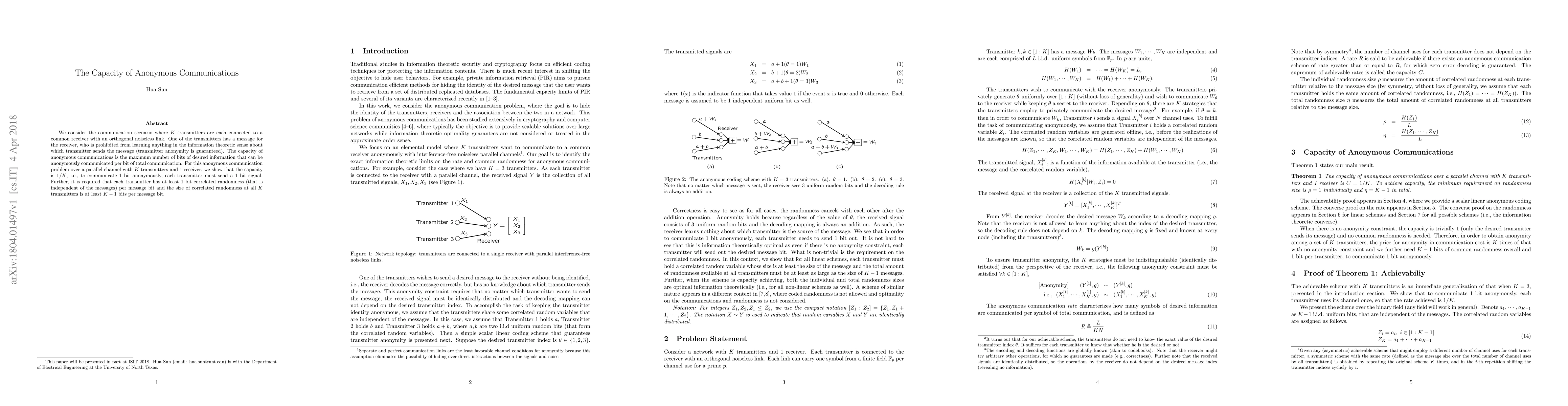 We consider the communication scenario where K transmitters are each connected to a common receiver with an orthogonal noiseless link. One of the transmitters has a message for the receiver, who is prohibited from learning anything in the information theoretic sense about which transmitter sends the message (transmitter anonymity is guaranteed). The capacity of anonymous communications is the maximum number of bits of desired information that can be anonymously communicated per bit of total communication. For this anonymous communication problem over a parallel channel with K transmitters and 1 receiver, we show that the capacity is 1/K, i.e., to communicate 1 bit anonymously, each transmitter must send a 1 bit signal. Further, it is required that each transmitter has at least 1 bit correlated randomness (that is independent of the messages) per message bit and the size of correlated randomness at all K transmitters is at least K-1 bits per message bit.