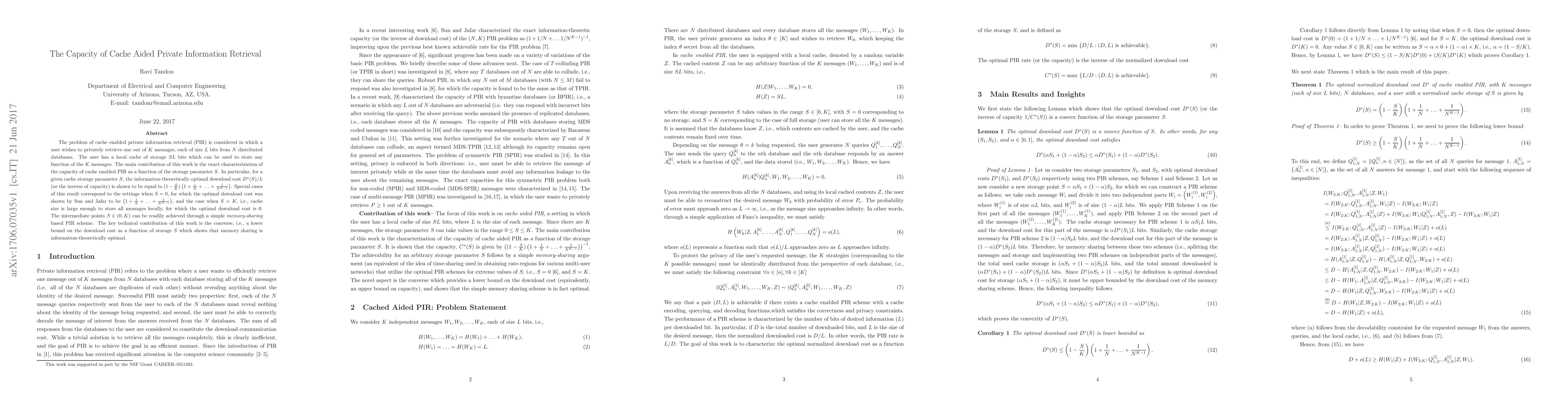 This paper characterizes the capacity of cache-aided private information retrieval (PIR), determining the optimal download cost for retrieving one message privately from multiple databases. It shows that the download cost is a function of cache size, with optimal costs achieved through memory-sharing schemes.