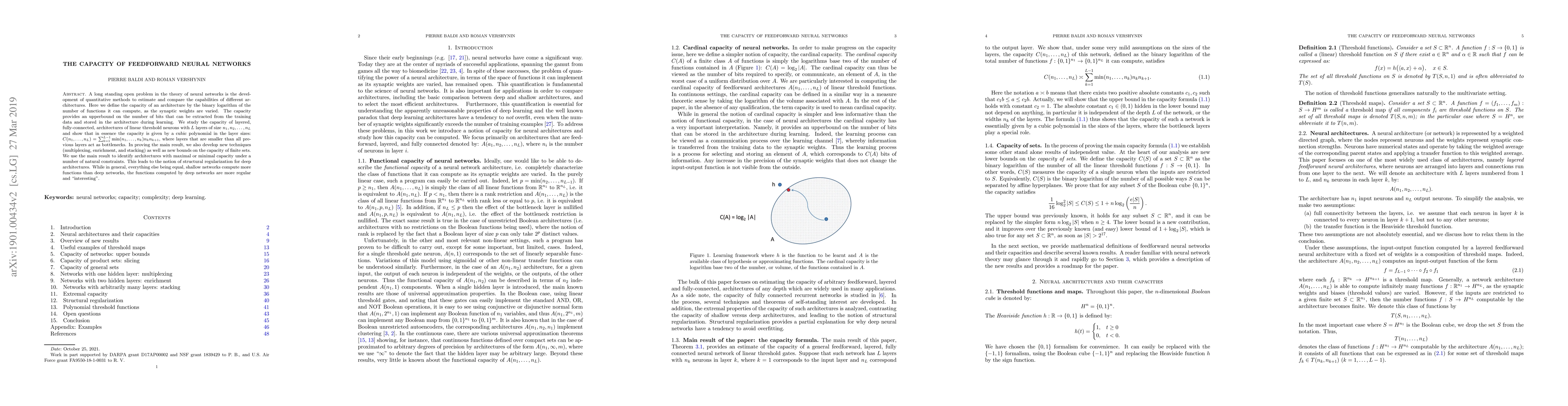 This paper develops a quantitative method to estimate the capacity of feedforward neural networks, defined as the binary logarithm of the number of functions they can compute. It shows that the capacity of layered, fully-connected architectures is given by a cubic polynomial in layer sizes, and introduces techniques for structural regularization to optimize network performance.