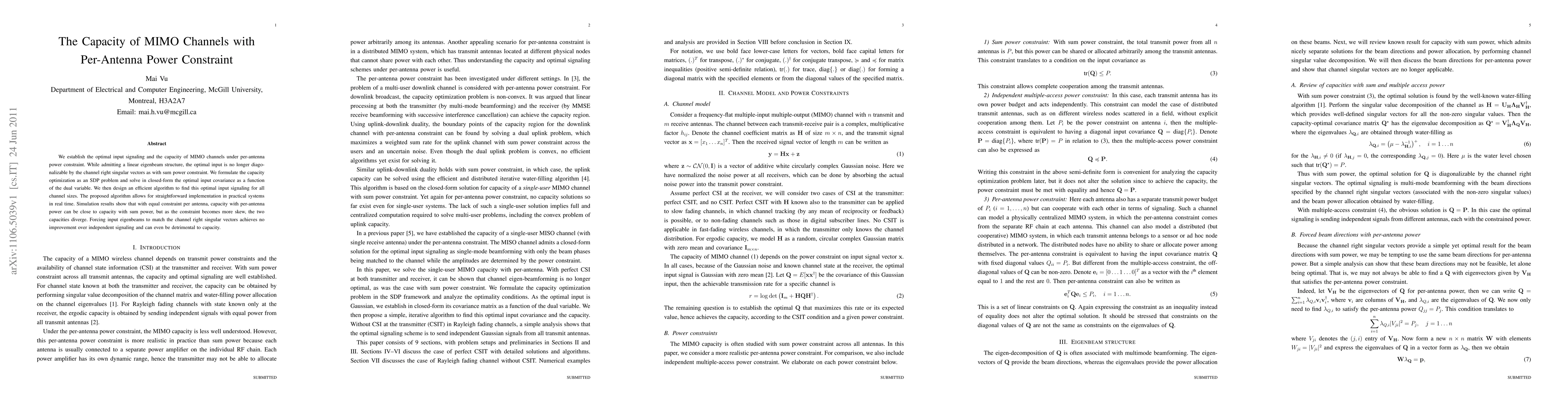 This paper investigates the optimal input signaling and capacity of MIMO channels under per-antenna power constraints, formulating the problem as an SDP and solving it in closed form. The proposed algorithm enables efficient real-time implementation, showing that per-antenna power constraints can yield capacities close to sum power constraints but diverge under more skewed constraints.