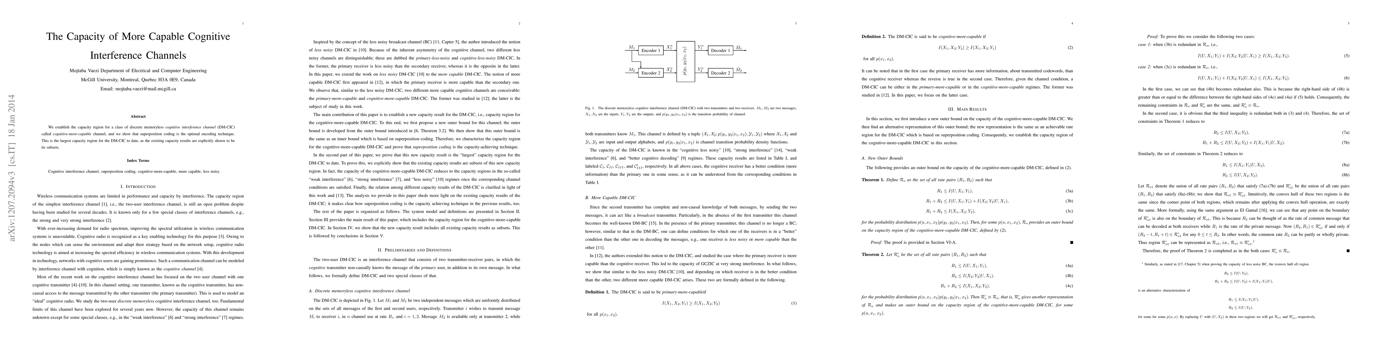 Summary: This paper establishes the optimal capacity region for a cognitive-more-capable interference channel using superposition coding, demonstrating it as the largest known capacity region for discrete memoryless cognitive interference channels. Existing capacity results are shown to be subsets of this new region.