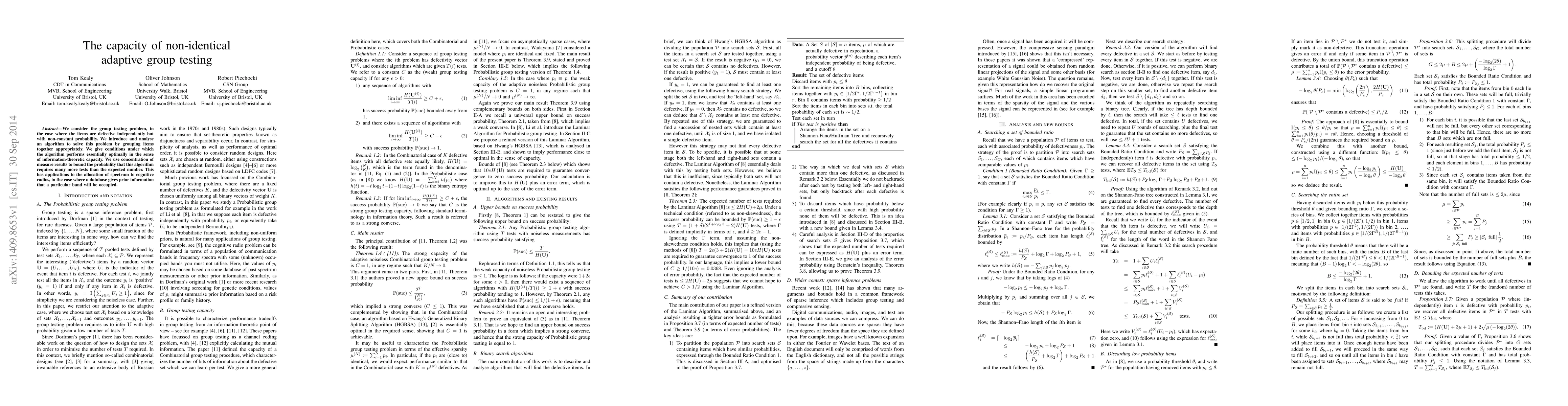 We consider the group testing problem, in the case where the items are defective independently but with non-constant probability. We introduce and analyse an algorithm to solve this problem by grouping items together appropriately. We give conditions under which the algorithm performs essentially optimally in the sense of information-theoretic capacity. We use concentration of measure results to bound the probability that this algorithm requires many more tests than the expected number. This has applications to the allocation of spectrum to cognitive radios, in the case where a database gives prior information that a particular band will be occupied.