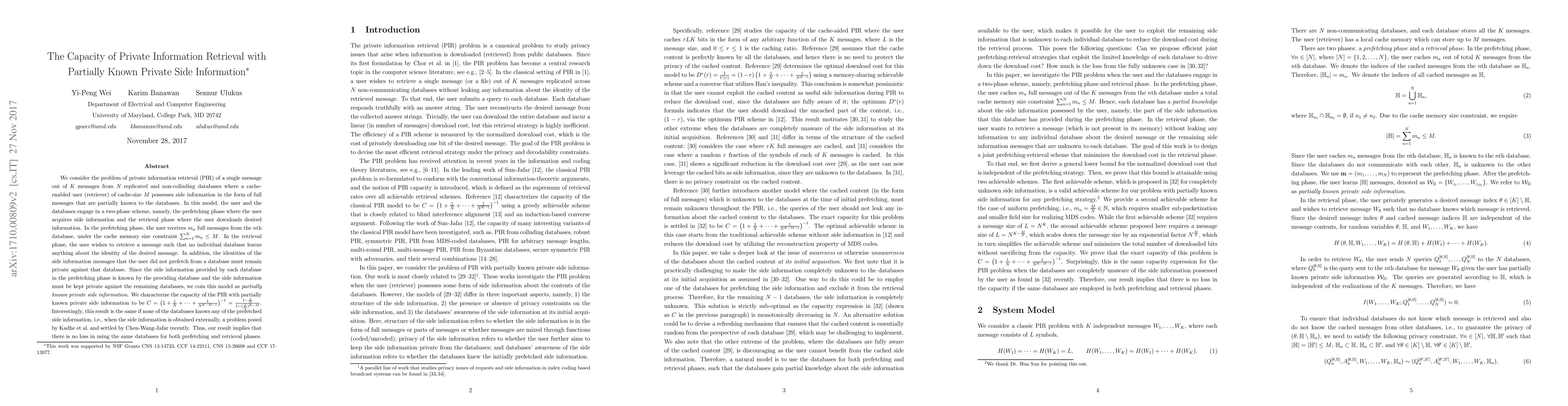 We consider the problem of private information retrieval (PIR) of a single message out of $K$ messages from $N$ replicated and non-colluding databases where a cache-enabled user (retriever) of cache-size $M$ possesses side information in the form of full messages that are partially known to the databases. In this model, the user and the databases engage in a two-phase scheme, namely, the prefetching phase where the user acquires side information and the retrieval phase where the user downloads desired information. In the prefetching phase, the user receives $m_n$ full messages from the $n$th database, under the cache memory size constraint $\sum_{n=1}^N m_n \leq M$. In the retrieval phase, the user wishes to retrieve a message such that no individual database learns anything about the identity of the desired message. In addition, the identities of the side information messages that the user did not prefetch from a database must remain private against that database. Since the side information provided by each database in the prefetching phase is known by the providing database and the side information must be kept private against the remaining databases, we coin this model as \textit{partially known private side information}. We characterize the capacity of the PIR with partially known private side information to be $C=\left(1+\frac{1}{N}+\cdots+\frac{1}{N^{K-M-1}}\right)^{-1}=\frac{1-\frac{1}{N}}{1-(\frac{1}{N})^{K-M}}$. Interestingly, this result is the same if none of the databases knows any of the prefetched side information, i.e., when the side information is obtained externally, a problem posed by Kadhe et al. and settled by Chen-Wang-Jafar recently. Thus, our result implies that there is no loss in using the same databases for both prefetching and retrieval phases.