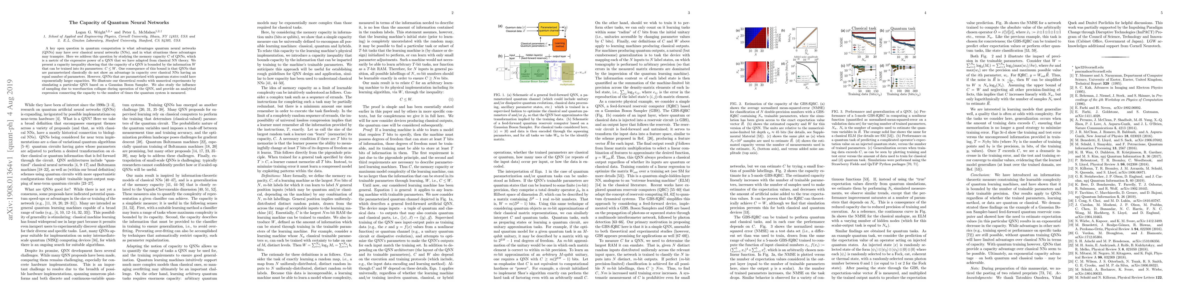This paper investigates the memory capacity of quantum neural networks (QNNs) and compares it to classical neural networks. It finds that classically parameterized QNNs do not outperform classical NNs in capacity, but quantum-parameterized QNNs could have exponentially larger capacities. The study concludes with numerical experiments simulating a Gaussian Boson Sampler QNN and analyzes the impact of wavefunction collapse on capacity.