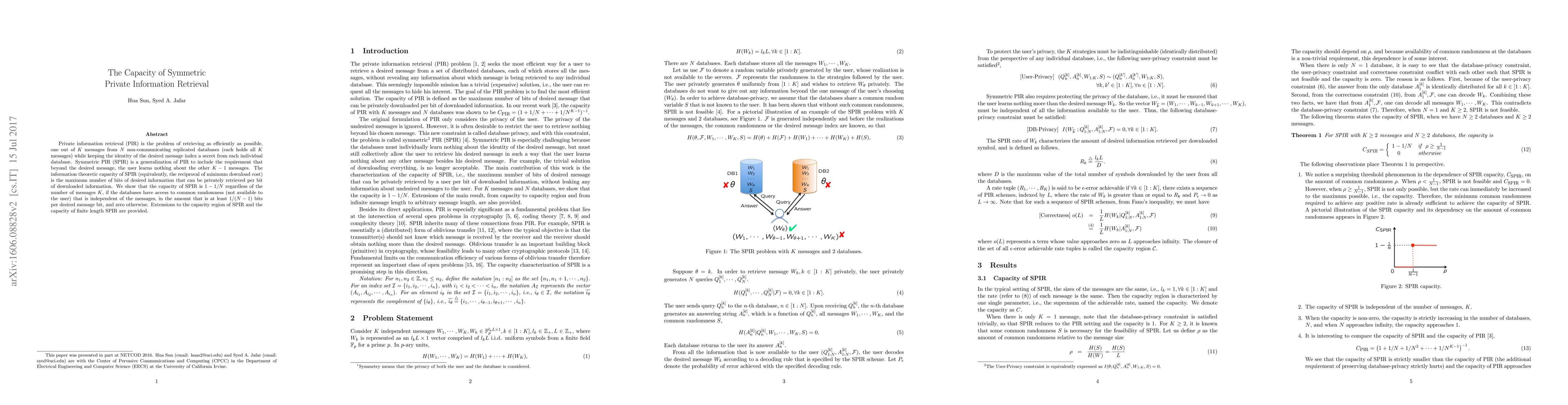 The research paper finds that the capacity of symmetric private information retrieval is 1-1/N, where N is the number of databases, if they have access to common randomness independent of the messages in a certain amount.