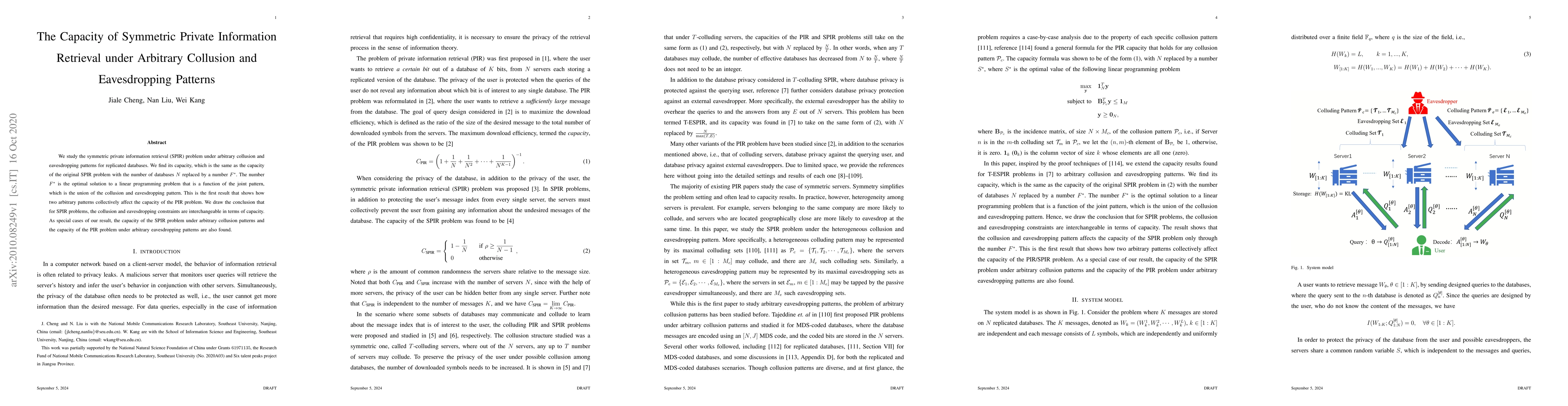 The paper finds that the capacity of symmetric private information retrieval under arbitrary collusion and eavesdropping patterns is equivalent to a new number $F^*$, which is determined by a linear programming problem related to the joint pattern of both constraints. The result shows that collusion and eavesdropping patterns are interchangeable in terms of capacity.