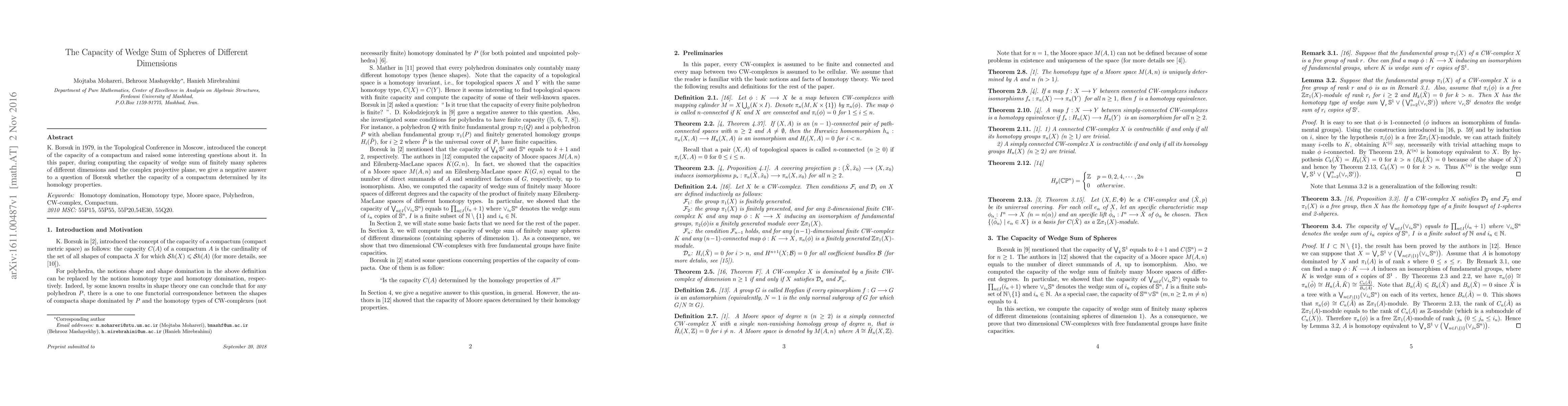 K. Borsuk in 1979, in the Topological Conference in Moscow, introduced the concept of the capacity of a compactum and raised some interesting questions about it. In this paper, during computing the capacity of wedge sum of finitely many spheres of different dimensions and the complex projective plane, we give a negative answer to a question of Borsuk whether the capacity of a compactum determined by its homology properties.