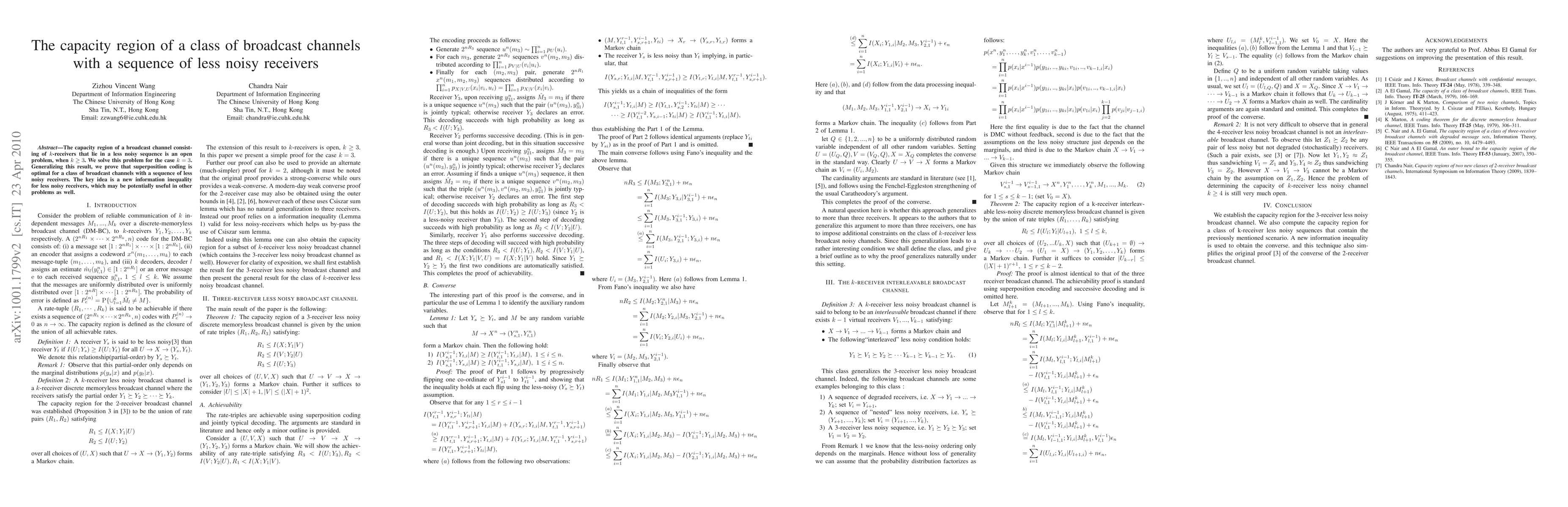 This paper resolves the capacity region problem for a broadcast channel with three receivers arranged in a sequence of decreasing noise levels, demonstrating that superposition coding is optimal for this configuration.