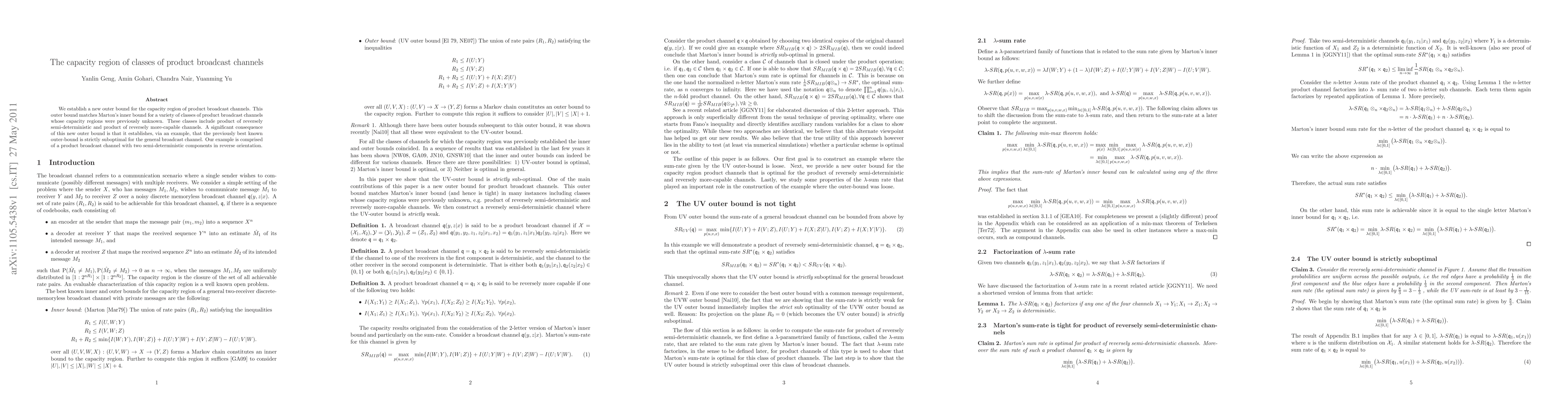 We establish a new outer bound for the capacity region of product broadcast channels. This outer bound matches Marton's inner bound for a variety of classes of product broadcast channels whose capacity regions were previously unknown. These classes include product of reversely semi-deterministic and product of reversely more-capable channels. A significant consequence of this new outer bound is that it establishes, via an example, that the previously best known outer-bound is strictly suboptimal for the general broadcast channel. Our example is comprised of a product broadcast channel with two semi-deterministic components in reverse orientation.