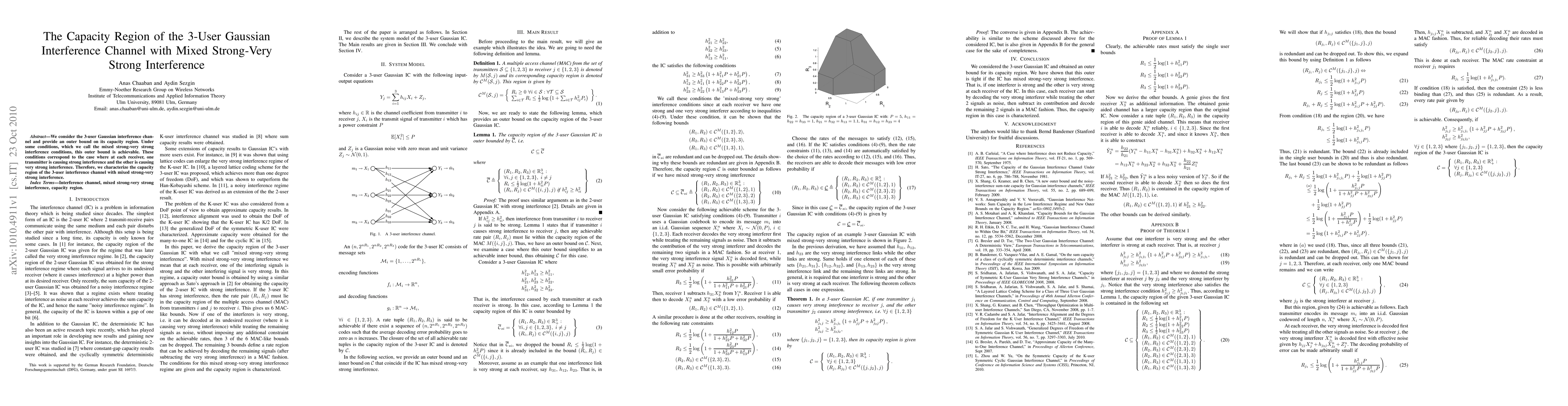 This paper provides an outer bound on the capacity region of a 3-user Gaussian interference channel under mixed strong-very strong interference conditions, demonstrating that this bound is achievable under specific circumstances.