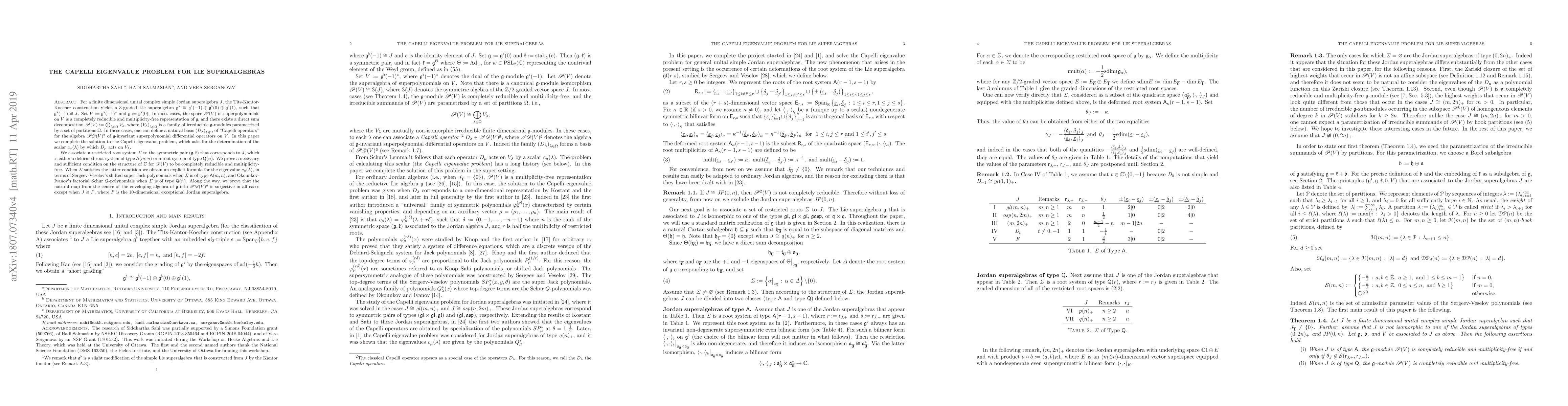 For a finite dimensional unital complex simple Jordan superalgebra $J$, the Tits-Kantor-Koecher construction yields a 3-graded Lie superalgebra $\mathfrak g_\flat\cong \mathfrak g_\flat(-1)\oplus\mathfrak g_\flat(0)\oplus\mathfrak g_\flat(1)$, such that $\mathfrak g_\flat(-1)\cong J$. Set $V:=\mathfrak g_\flat(-1)^*$ and $\mathfrak g:=\mathfrak g_\flat(0)$. In most cases, the space $\mathcal P(V)$ of superpolynomials on $V$ is a completely reducible and multiplicity-free representation of $\mathfrak g$, with a decomposition $\mathcal P(V):=\bigoplus_{\lambda\in\Omega}V_\lambda$, where $\left(V_\lambda\right)_{\lambda\in\Omega}$ is a family of irreducible $\mathfrak g$-modules parametrized by a set of partitions $\Omega$. In these cases, one can define a natural basis $\left(D_\lambda\right)_{\lambda\in\Omega}$ of "Capelli operators" for the algebra $\mathcal{PD}(V)^{\mathfrak g}$. In this paper we complete the solution to the Capelli eigenvalue problem, which is to determine the scalar $c_\mu(\lambda)$ by which $D_\mu$ acts on $V_\lambda$. We associate a restricted root system $\mathit{\Sigma}$ to the symmetric pair $(\mathfrak g,\mathfrak k)$ that corresponds to $J$, which is either a deformed root system of type $\mathsf{A}(m,n)$ or a root system of type $\mathsf{Q}(n)$. We prove a necessary and sufficient condition on the structure of $\mathit{\Sigma}$ for $\mathcal{P}(V)$ to be completely reducible and multiplicity-free. When $\mathit{\Sigma}$ satisfies the latter condition we obtain an explicit formula for the eigenvalue $c_\mu(\lambda)$, in terms of Sergeev-Veselov's shifted super Jack polynomials when $\mathit{\Sigma}$ is of type $\mathsf{A}(m,n)$, and Okounkov-Ivanov's factorial Schur $Q$-polynomials when $\mathit{\Sigma}$ is of type $\mathsf{Q}(n)$.